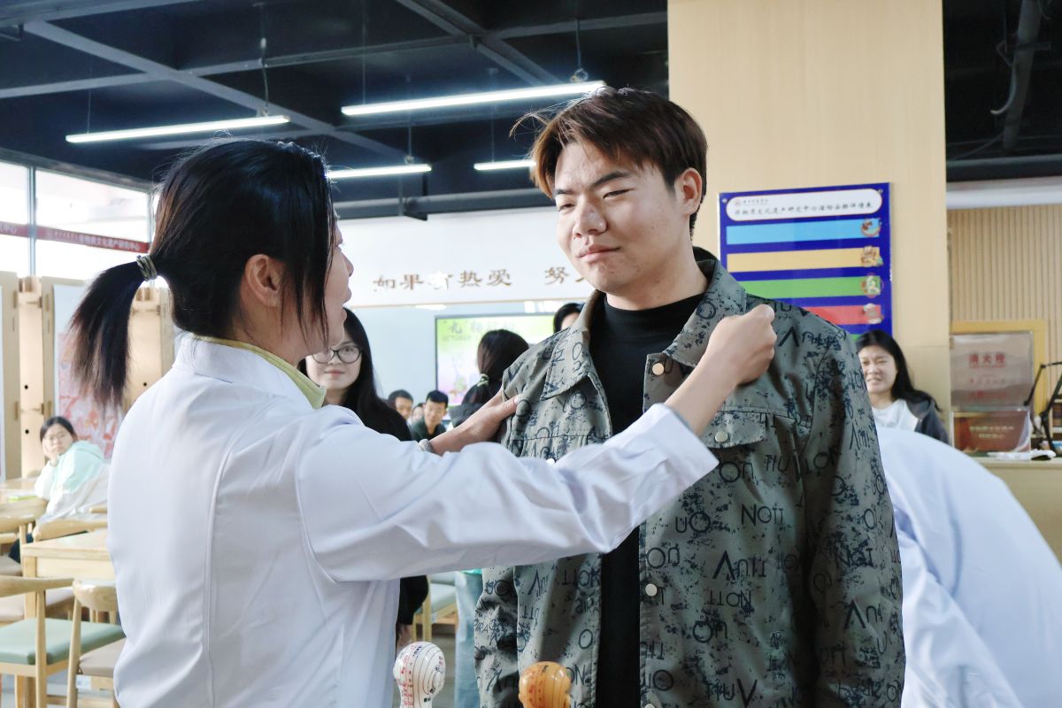 穴位推拿区让现场氛围感直接拉满,1:1还原的人体骨骼模型直接戳中大家的好奇心,途经的同学纷纷驻足观察。中医推拿师杨彦梅医生现场驻场指导,手把手拆解足三里、内关等“养生王牌穴位”的简便取穴口诀,对于经常熬夜的人群,按揉相应穴位5分钟,立马满血复活!