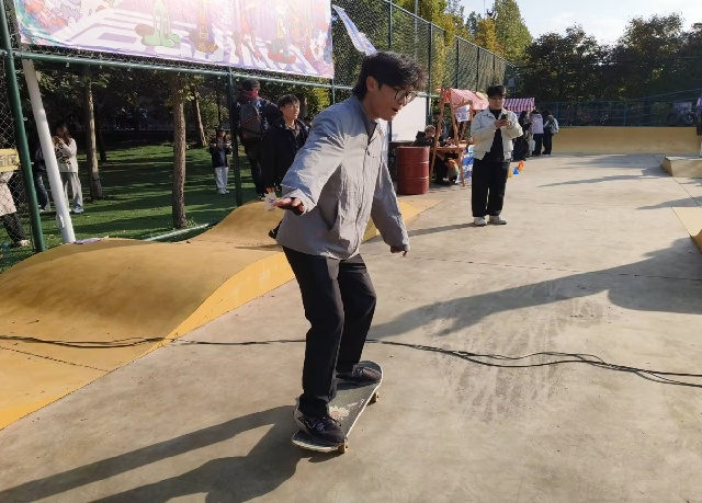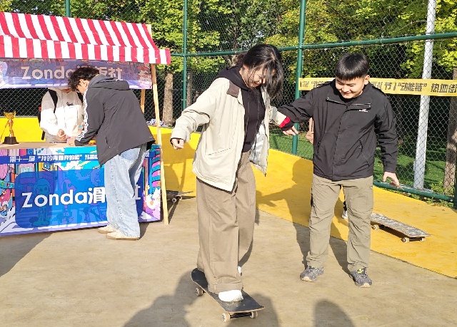 “踩上滑板时手心里全是汗,学姐扶着挪了几步,没掌握好平衡还晃了一下,但没像想象中那样摔下来,反而敢稍微松开手试试了。”一位第一次体验滑板的远景学院的新生看着脚下的滑板,眼里多了点底气,他觉得这场活动最难得的是给了自己“试错”的机会,原来面对没做过的事,自己也能慢慢找到勇气。