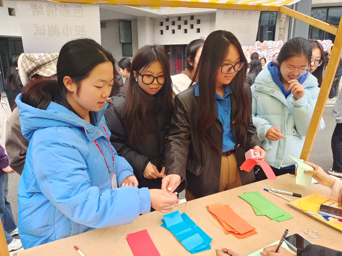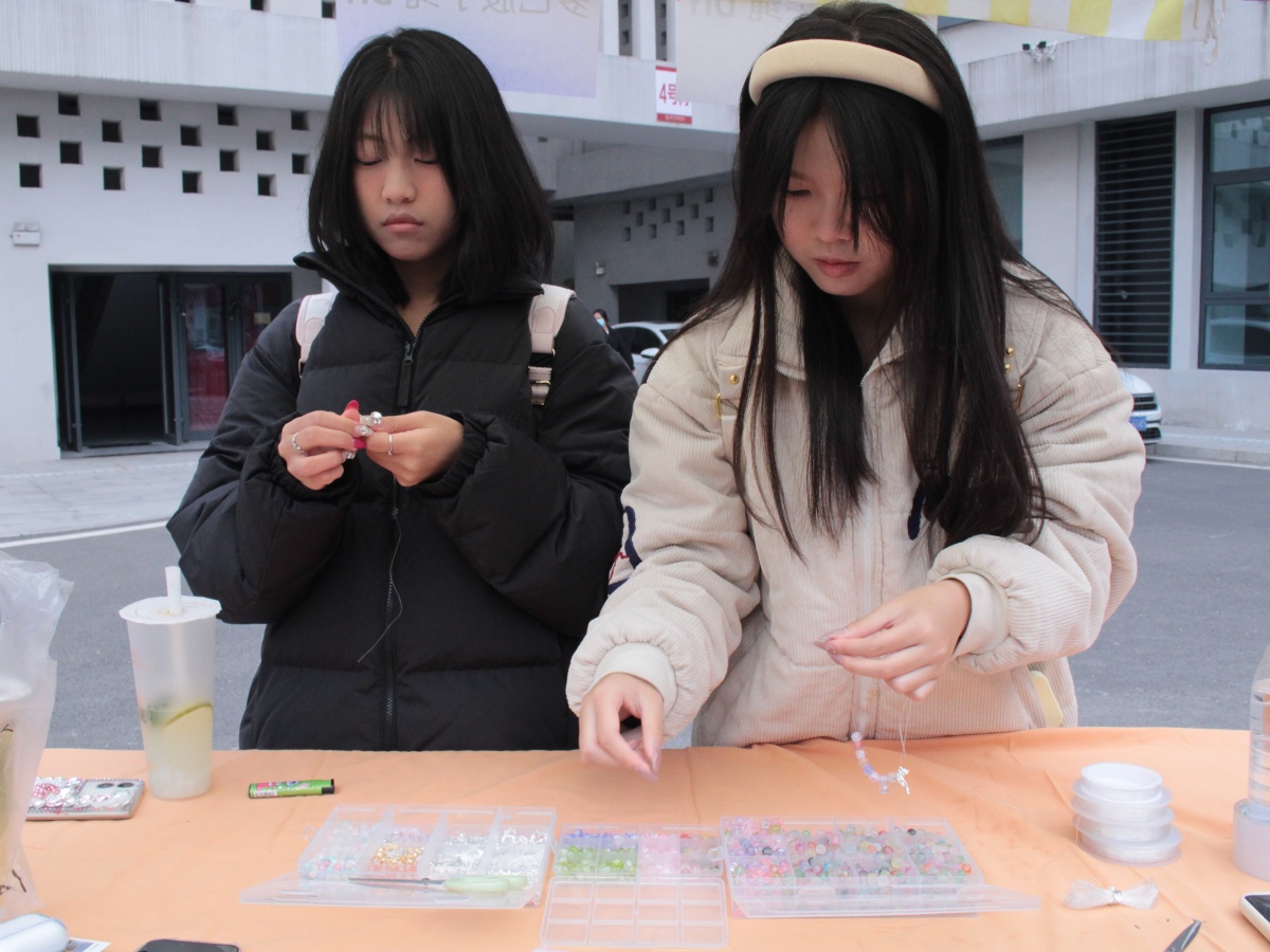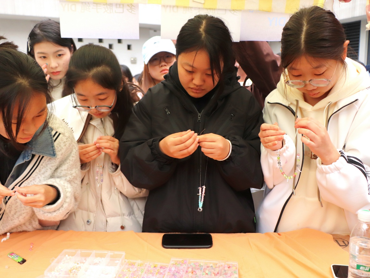 把喜欢的颜色,编进能随身携带的时光里。多巴胺手绳DIY区毫无疑问成为全场的人气担当!五彩斑斓的绳线在同学们灵巧的指尖穿梭飞舞,各式字母珠子与可爱挂件点缀其间,每一根绳线的缠绕、每一颗珠子的串联,都在勾勒独一无二的幸运手环。围坐桌前的身影各有专注,初学的同学紧盯志愿者的示范动作,指尖跟着慢动作起落,从生疏地绕线到逐渐掌握节奏,每一步都藏着对“亲手创造”的郑重;熟稔技巧的同学则带着巧思创作,先将刻有名字首字母的珠子稳稳穿入绳中,再细心挂上小巧铃铛,抬手晃动时,清脆声响里满是对个性表达的雀跃。更贴心的是,只要凭一枚活动特制的铜色纪念币,就能免费带走自己亲手制作的手绳,让这份快乐有了专属“信物”。