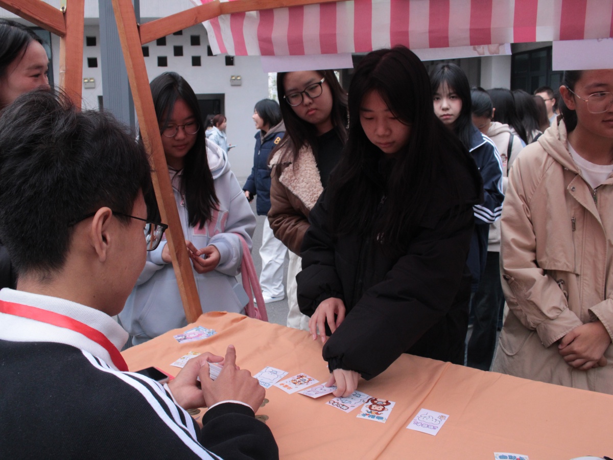 “未知的盒子里,藏着今日份的小幸运”。情绪盲盒区的欢呼声就没断过。彩色纸盒印着笑脸或星星,在多层展示架上排得整整齐齐。同学们轮流上前挑盒,拆盒的瞬间满是期待——有同学摸出惊喜小礼物,眼睛亮了起来;也有同学展开暖心鼓励卡,嘴角悄悄弯成弧度。旁边的“贸易模拟情绪局”更有创意,每个同学手里攥着5张情绪卡片,“勇气”“快乐”“耐心”“自信”“乐观”的字样亮闪闪的。“我用‘耐心’跟你换‘快乐’行不行?”“那我得再加张‘自信’才换!”小声的商量里满是热闹,讨价还价时的笑声传得老远。同学们玩得不亦乐乎,还悄悄学会了“管理情绪财富”——原来“耐心”能换得“快乐”,遇事多一分从容等候,往往能收获满心顺遂。