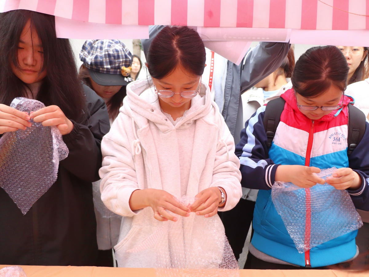 “听过压力‘碎掉’的声音吗?是指尖与泡泡纸相拥的脆响。”解压捏捏乐挑战赛的现场,连片的“咔嚓——砰”声裹着笑意飘满角落。桌面上,印着浅蓝条纹、缀着小碎花的泡泡纸叠得整齐,等着被同学们解锁。拇指狠狠按压、指尖逐个捏破、双手齐动让脆响连成串……同学们蹙着的眉头悄悄舒展开,眼底渐渐升起轻松的笑意,满场都是把压力“捏跑”的鲜活劲儿。