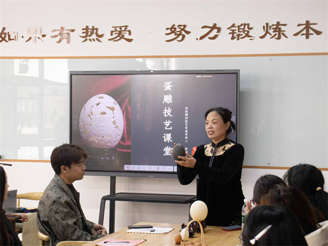 活动正式启动后,符润娥老师首先为在场学生带来生动讲解。从蛋雕技艺承载的千年匠心历史,到其“以蛋壳为纸、刻刀为笔”的东方美学特色,再到本次活动的具体操作流程与安全规范,内容清晰详实。这一环节不仅帮学生快速建立对蛋雕非遗的认知,更激发了大家动手创作的期待,为后续实践环节做好铺垫。