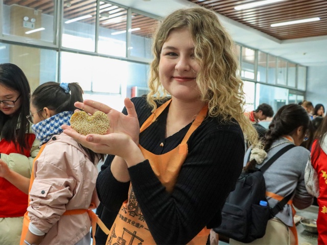 在志愿者的陪同下,留学生们作为跨文化体验的“同行者”,大家共同解锁与品味手工制作里最质朴的“温暖联结”。太谷饼成为行走的文化名片,在信院学子的见证下完成跨越时空的文明传递,原来最朴素的食物里,藏着最永恒的文化基因。