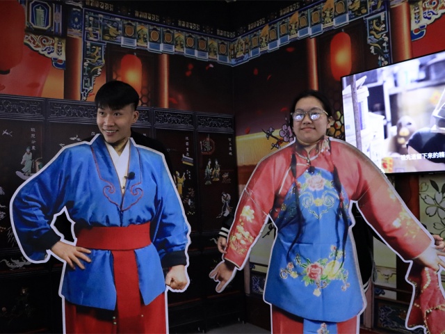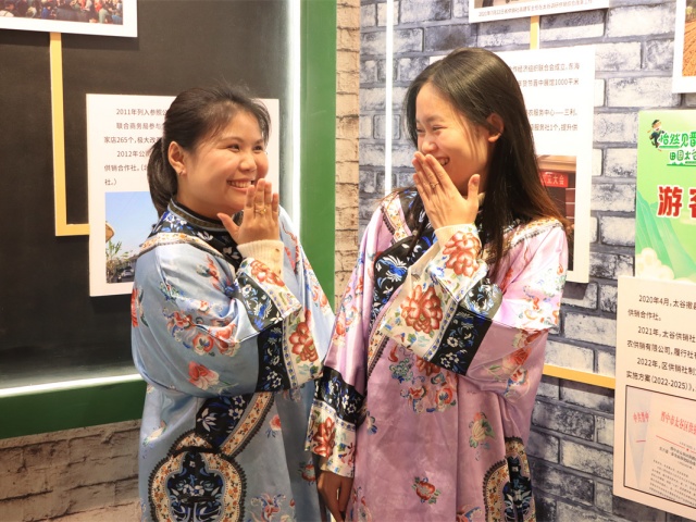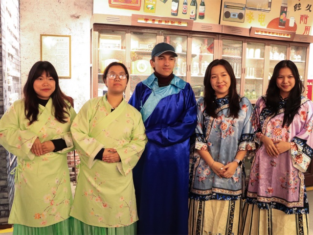 当指尖真正触碰到历史肌理,文化传承便从书本概念转化为一场可感可知的“全息投影”。志愿者和留学生们卸下游客身份,以“探秘者”的姿态开启与供销社的对话。在大家学着用异国腔调学着念“供销社”三个汉字时,粮票、搪瓷盆突然成了最生动的文化坐标。他们将镜头转向老式杆秤,生活智慧正通过数字媒介完成“全球共享”。有的异国青年用手机记录下这“沉浸式换装”的瞬间,对着换上晋商长袍的自己露出惊喜的微笑,仿佛完成了与这片土地的第一次深度“绑定”。