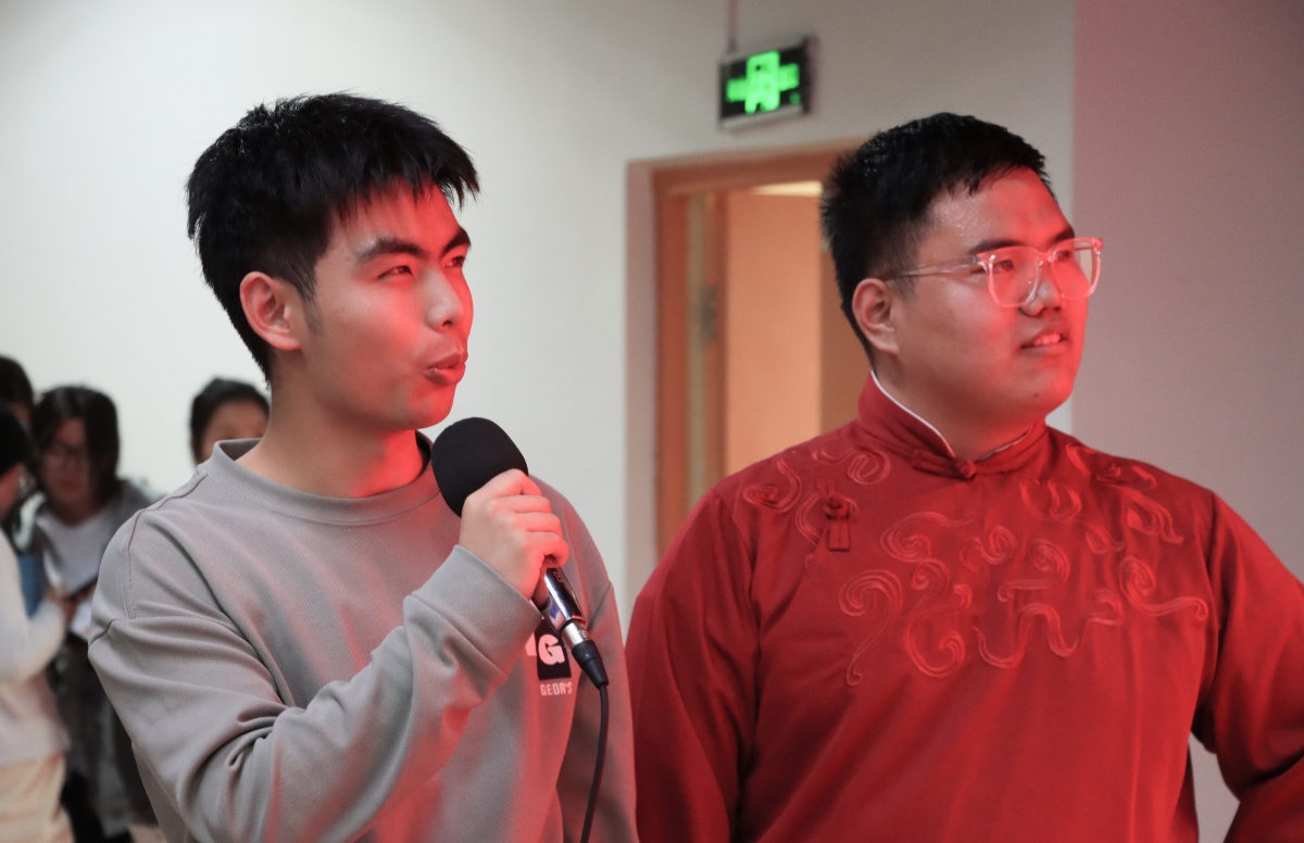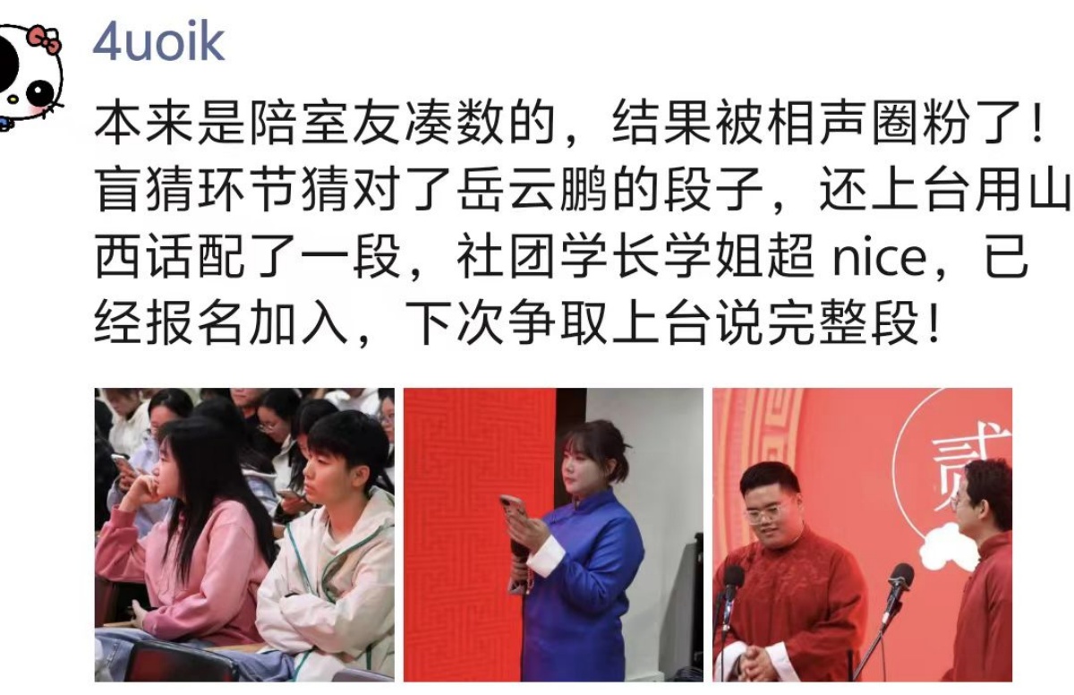 智能工程学院一位新生分享道:“本来是陪室友凑数的,结果被相声圈粉了!盲猜环节猜对了岳云鹏的段子,还上台用山西话配了一段,社团学长学姐超Nice,已经报名加入,下次争取上台说完整段!”