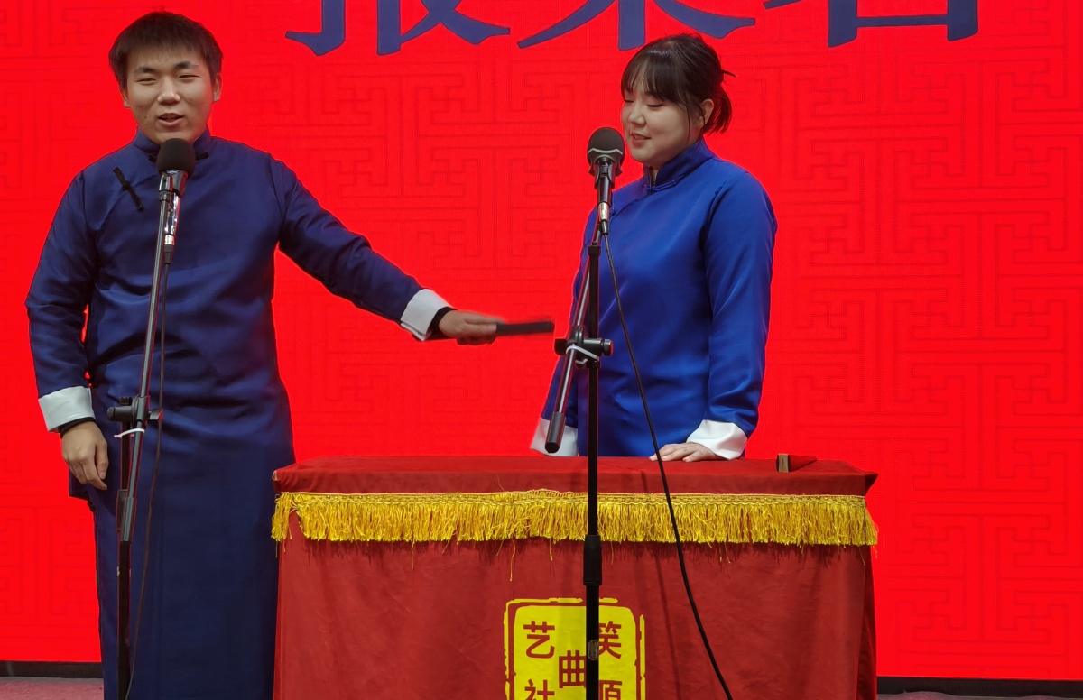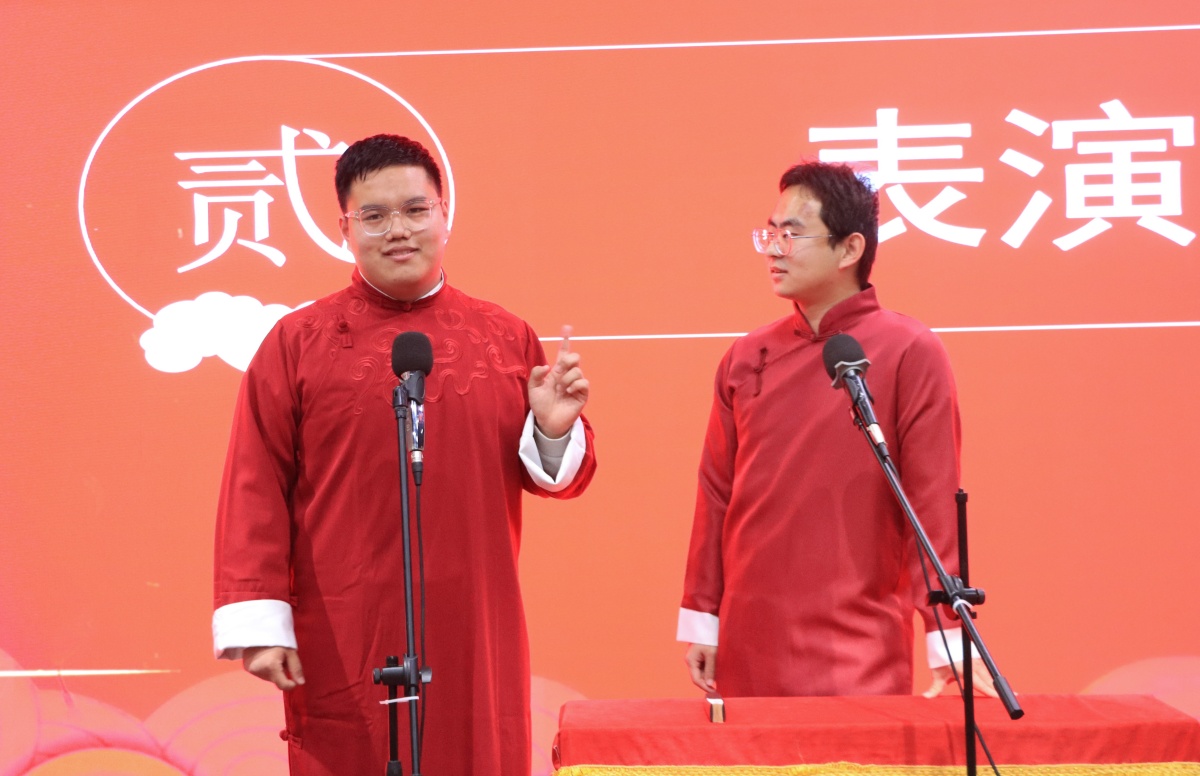 舞台中央,笑源曲艺社的同学们用实力诠释“传统也能潮起来”。贾霄栋与郑志豪搭档的《论捧逗》,在经典桥段中加入校园生活梗 ——“你这捧哏跟上课走神似的,全程不在状态”“你逗哏还不如食堂阿姨打菜,净捡边角料说”,接地气的改编让观众会心大笑,两人夸张的神态与默契的节奏把控,把逗哏的灵动与捧哏的沉稳演绎得淋漓尽致。