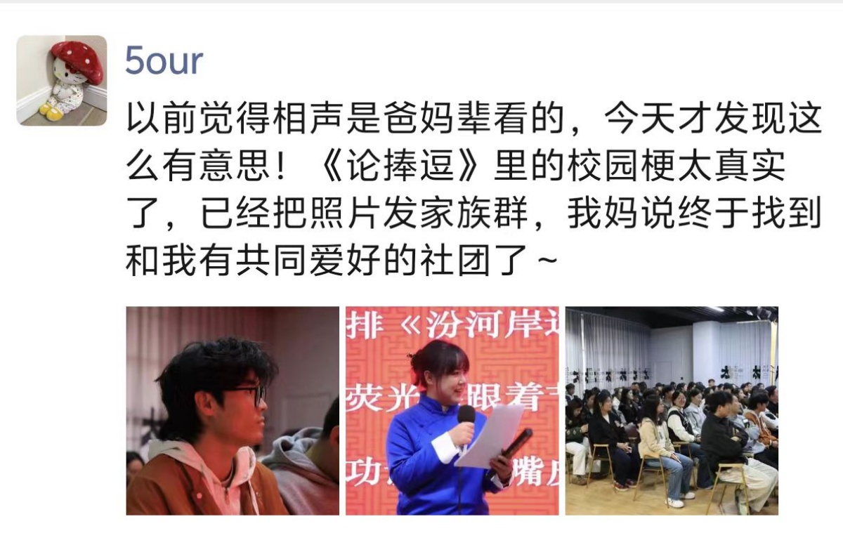 大健康学院一位大二同学道:“以前觉得相声是爸妈辈看的,今天才发现这么有意思!《论捧逗》里的校园梗太真实了,已经把照片发家族群,我妈说终于找到和我有共同爱好的社团了。”