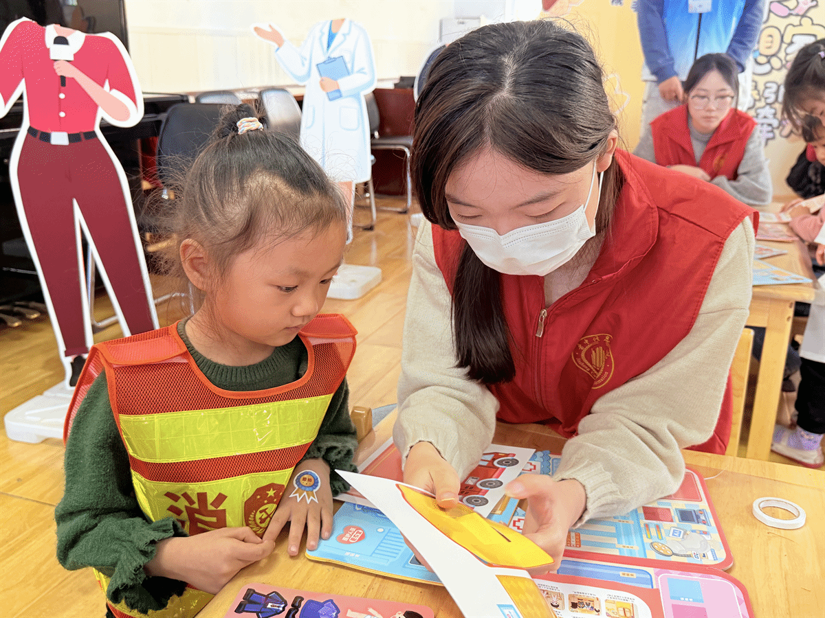 从故事的聆听者化身为故事的主人公,小朋友们穿上制服让抽象的“职业”概念瞬间变得可感可触,DIY职业机关书与拼图的过程中,他们用指尖的探索解构不同职业的奥秘,亲手触摸梦想的形状。于志愿者而言,此刻的角色已从讲述者转变为温暖的守护者与观察者,他们协助孩子们穿戴“行头”,见证着稚嫩脸庞上绽放的认真光芒;他们引导小手完成拼图,仿佛也拼接起自己曾经散落的初心。这场沉浸式体验,不仅是陪伴孩子将梦想具象化,更是一次对自我成长的温柔反刍——在童真的映照下,重新品味选择与担当的重量。