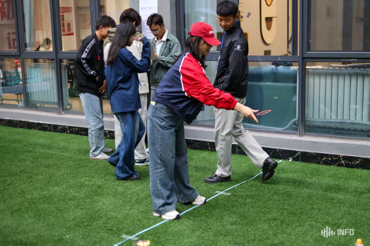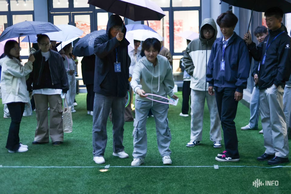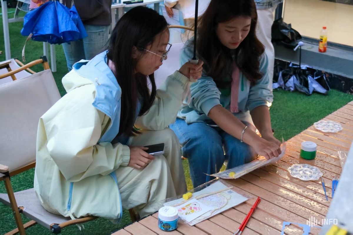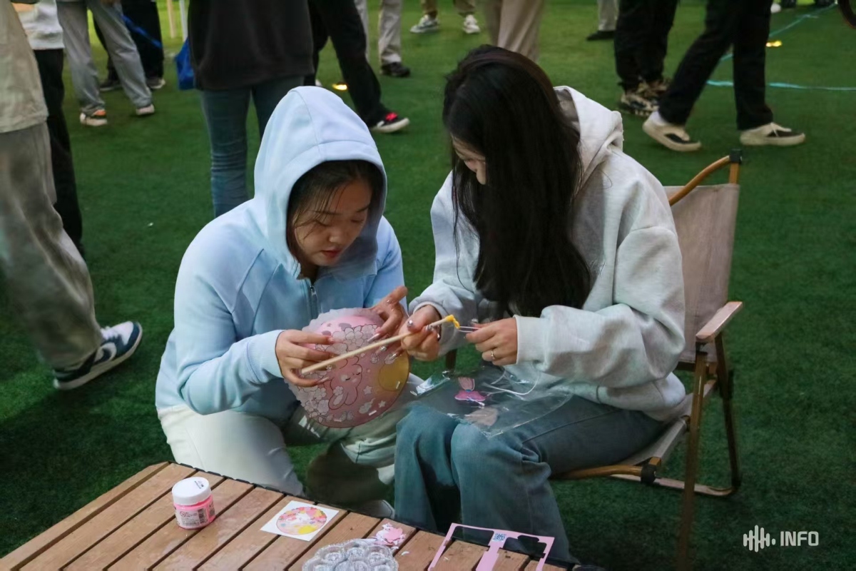 结束飞花令与猜谜的智力挑战后,同学们手持收获的兑换券,纷纷涌向充满趣味与创意的“套圈游戏”和“灯你来画”体验区。在套圈摊位前,大家专注瞄准、轻掷套圈,每当套中心仪零食便响起一阵欢快的掌声:而在灯笼绘制区,同学们则静心俯首,用画笔蘸取色彩,在不同的灯笼上DIY自己心仪的颜色,让每一盏灯笼都承载着独属于这个中秋节的记忆。让彼此间的友谊。在共同参与的乐趣里悄悄升温。