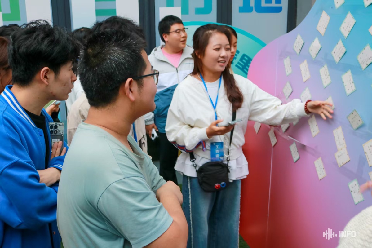 猜一纸灯谜,接一句诗词。灯谜区域,在各色谜题下,同学们或凝神思考,或热烈讨论。“举头望明月”打一常用语——这个我知道,是“仰光!”参加者兴奋地喊道。现场特意约定不使用智能设备搜索答案,这让每个猜中的同学都获得了满满的成就感。一转头,飞花令区域更是热闹非凡。工作人员早早备好题卡与纸笔,见同学们围拢过来,便笑着递上印着“月”字的提示卡;参与者或指尖轻叩桌面梳理诗句,或转身与身旁同伴分享刚想起的佳句。诗与谜相映,工作人员的细致陪伴与同学们的投入热情交织,共同织就了中秋节温润又鲜活的温暖片段。