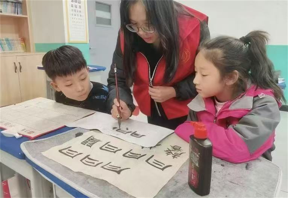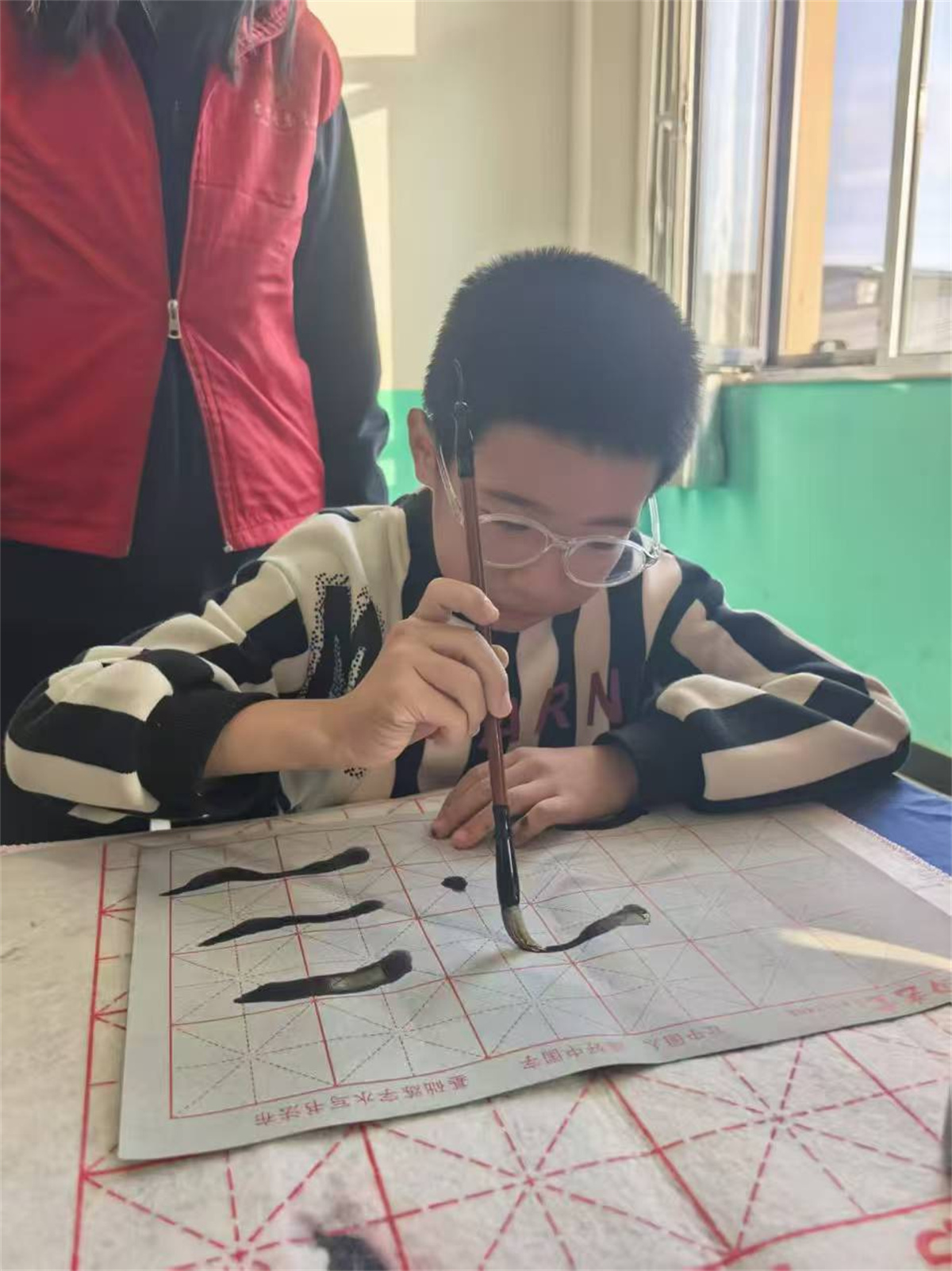 光透过教室的玻璃窗,在摊开的米字格宣纸上织就浅浅光影,风一吹便轻轻晃。志愿者们早早把案头收拾利落,砚台里新研的墨汁泛着温润光泽,闻着有股淡淡的墨香,兼毫笔静静斜倚在笔架上,笔毛还带着点湿润,笔尖凝着细碎墨痕,等候着与孩子们的第二次墨缘。