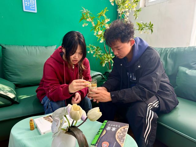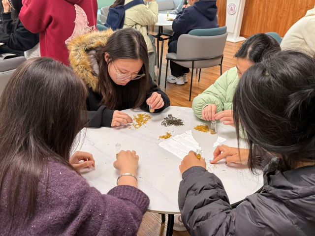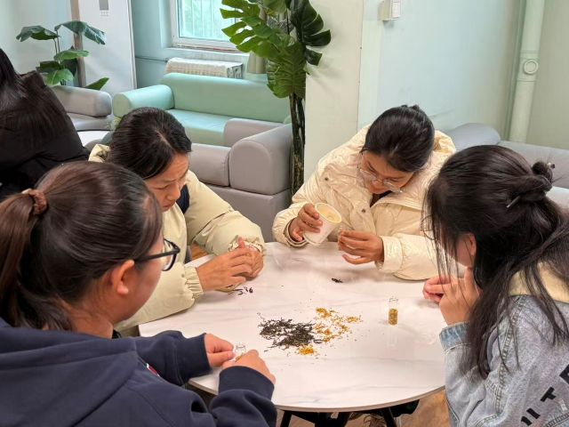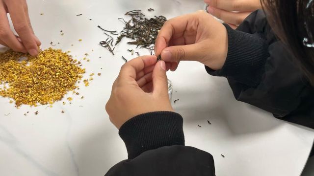 社员们以两三人为一组展开协作,现场充满对“制香”的好奇与期待。在原料处理环节,大家仔细挑拣桂花中的杂质,确保每一朵花瓣干净完整;分拣茶叶时,有人专注对比不同茶叶的香气差异,有人则根据个人喜好搭配茶叶品类,尝试调出独特的茶韵。