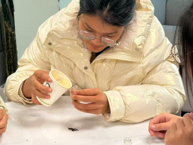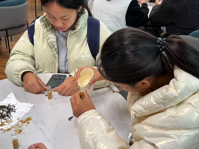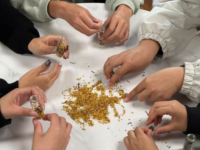 按照操作,社员们先将处理好的桂花或茶叶放入分装瓶,再精准倒入食用级酒精,部分社员还结合自己的创意,在瓶中加入少量干花装饰。密封前,大家纷纷在标签上写下自己的名字与制作日期,赋予每瓶香水专属的“纪念意义”。过程中,各组成员相互分享操作技巧——有人发现“轻轻按压桂花能让香气更快释放”,有人总结“茶叶碾碎后浸泡,茶韵更浓郁”,交流声与草木的清香交织,让手作过程成为社员间互动协作的温馨时刻。