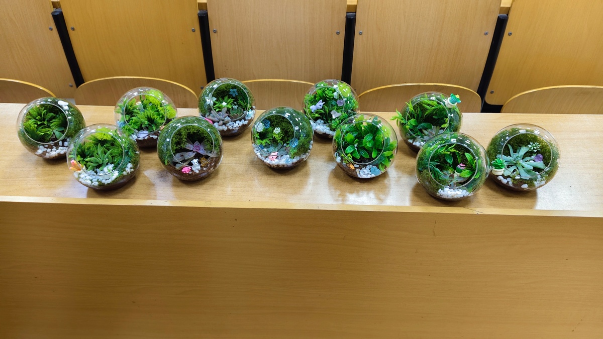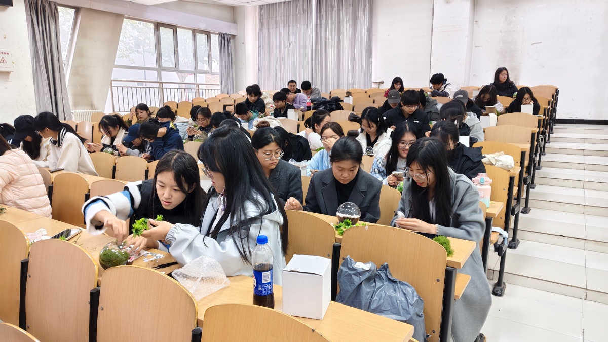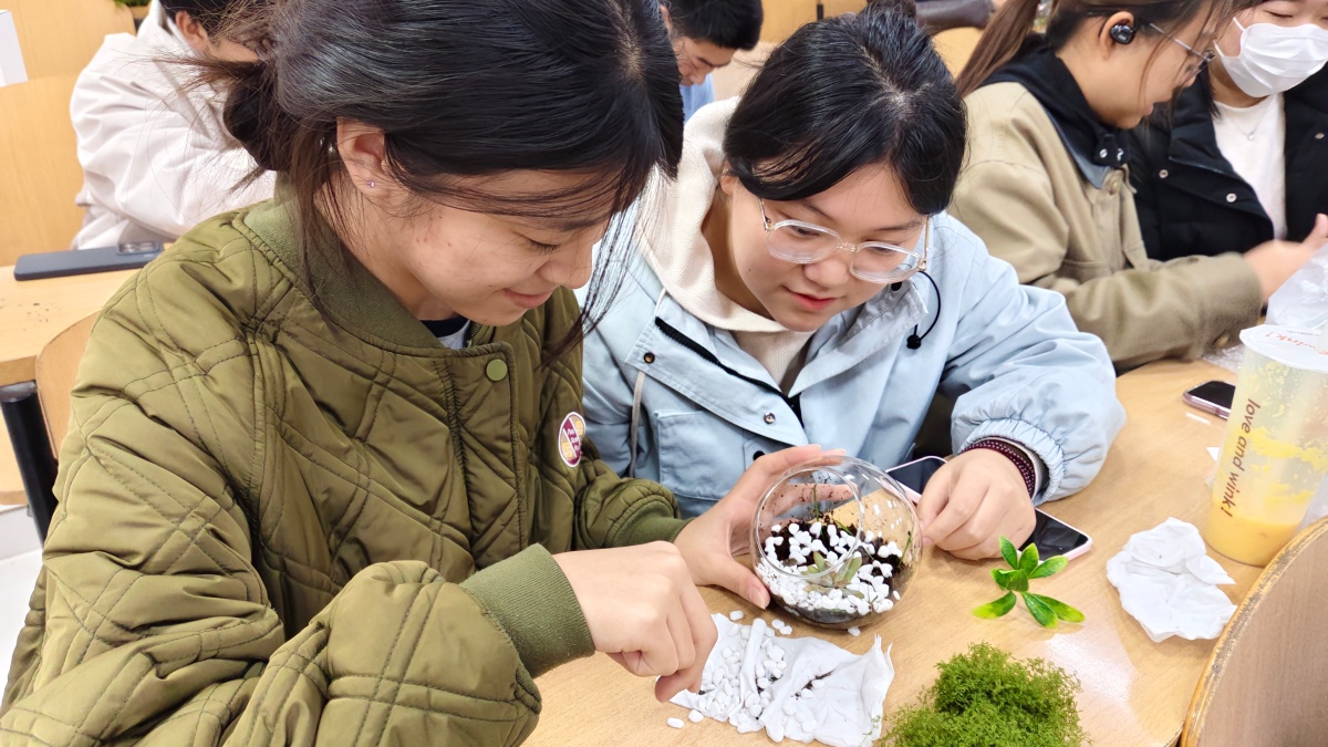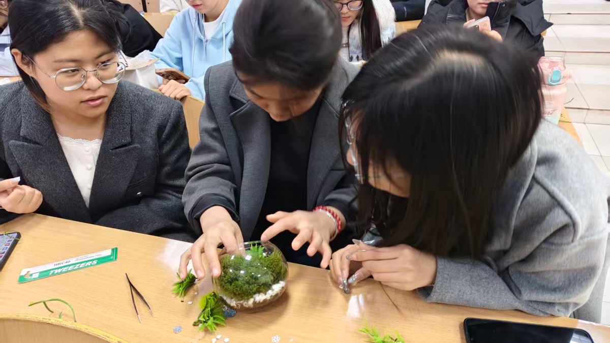 活动接近尾声,参与者们手持自己的作品合影留念,玻璃容器里的盎然绿意与脸上的洋溢笑意相互映衬,定格下温暖的瞬间。不少同学表示:“原来只要一点创意和耐心,就能把‘大自然’捧在手心!”这场“瓶中微界·植趣新生”的创作之旅,不仅让师生们收获了专属的微景观作品,更在快节奏的校园生活里,辟出一方慢下来感受自然的小天地——毕竟,能把“森林”“沙漠”装进玻璃瓶的魔法,本就足以让平淡日常焕发生机,让自然之美与创意之光,照亮每一个平凡的日子。