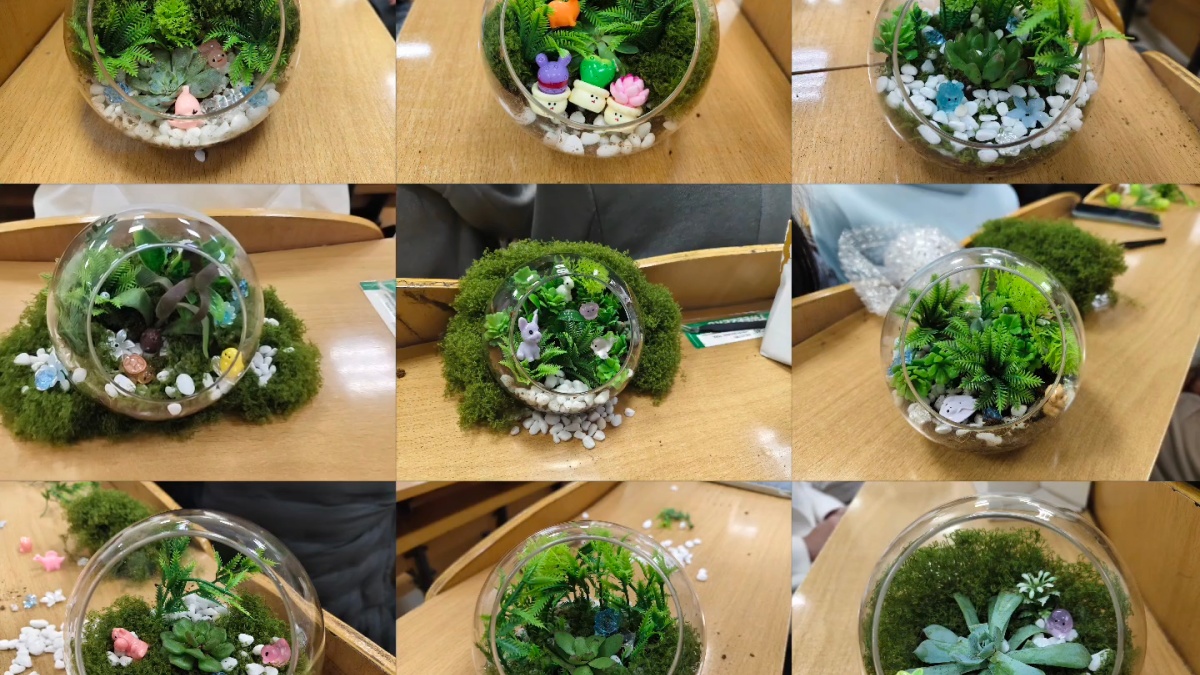 活动现场洋溢着温馨的氛围,阳光透过窗户的缝隙轻柔地洒落在桌案上。玻璃容器、苔藓、多肉植株、装饰摆件等材料整齐陈列,静静等候着创意的唤醒。随着主持人介绍活动规则与创作思路,参与者们眼中瞬间点亮期待的光芒——这不仅仅是一次简单的手工制作,更是一次将大自然的美好封存于容器之中的奇妙创作之旅。在这场旅途中,每个人都将化身为艺术家,用心灵和双手去感知、去塑造那份独特的自然韵味。桌案上散发的泥土气息和绿植的清新味道,仿佛让人提前领略到作品完成后那份充满生机与和谐的美妙场景。