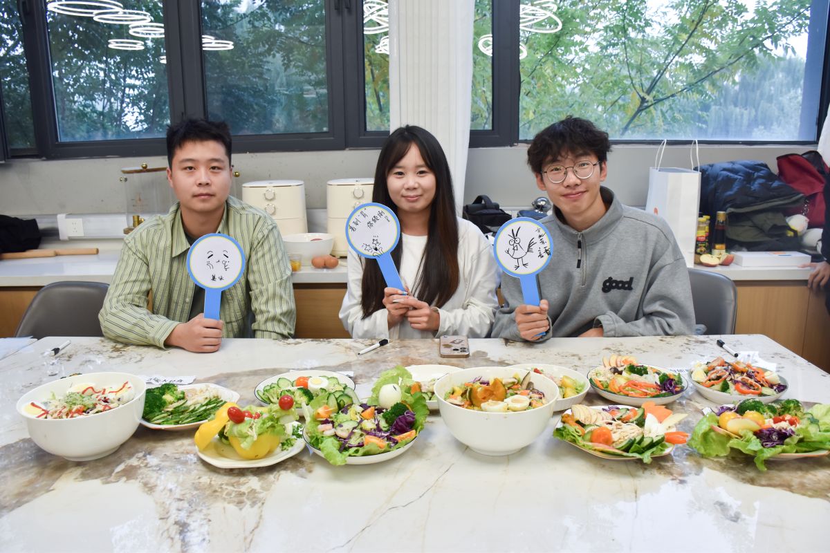 试吃官亮出打分牌,一致认为第二组的“翠彩轻蔬碗”,最有创意,从五组作品中脱颖而出。大家围坐一起,迫不及待地品尝自己的劳动成果。小口咀嚼,感受着食材的清爽本味;互相交流,传来阵阵欢声笑语,满是青春活力与对健康生活的热爱。
