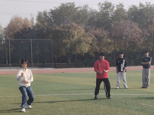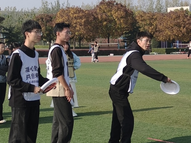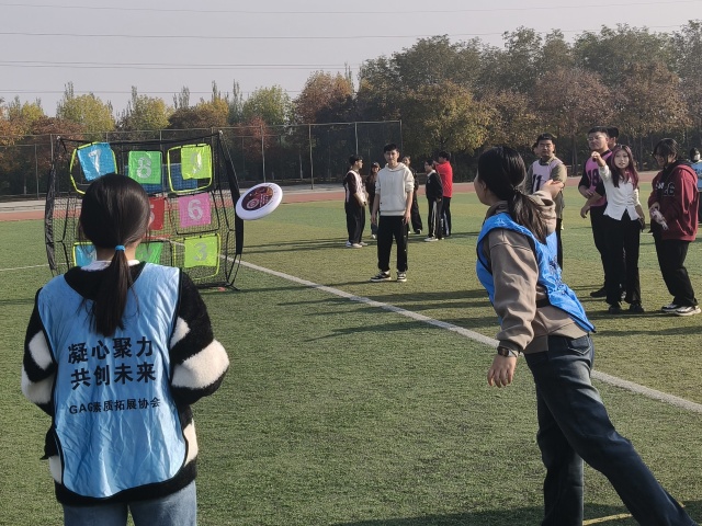 紧接着活动进入“武术飞盘掷准”环节。参加者需要在保持武术基本步型的基础上,完成飞盘的精准投掷。活动初期,部分学生在动作协调与力量控制方面遇到挑战,随着实践次数的增加,投掷的准确度明显提升。过程中场边喝彩声、惊叹声持续不断,“好球”的欢呼与“差一点满分”的惋惜相互交织。这一环节的设计体现了不同运动形式在技术层面的融合可能,为参加者提供了跨项目训练的新颖体验。