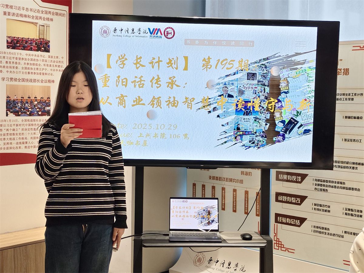 10月30日下午,商务英语学院于上河书院106览舟·大咖书屋展开了学长计划第195期:“重阳话传承:从商业领袖智慧中读懂‘守’与‘新’”。