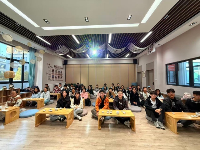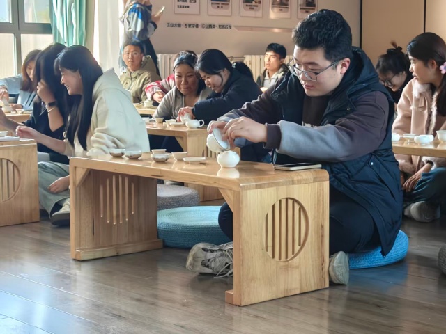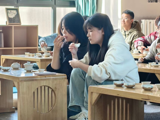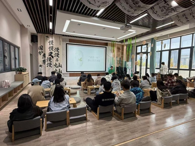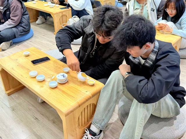 活动尾声,大家围坐一堂,共同探讨“茶道精神”。主讲人结合儒家之“礼”、道家之“自然”、佛家之“禅意”,深入解读“和、敬、清、寂”的核心内涵:“和”是与他人、自然的和谐共处;“敬”是对茶、他人与文化的由衷尊重;“清”是内心的清净与纯粹;“寂”是在宁静中感悟生活本真。分享感悟环节,参与者踊跃发言:有人称此前喝茶只为解渴,如今才明白倒茶“七分满”中蕴含的“留有余地”的人生智慧;有人说泡茶时的专注能让人忘却学业压力,收获内心放松。大家的发言真挚深刻,将本次品茶体验升华为对生活态度与精神追求的深度思考。