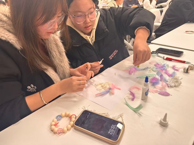 活动现场,一段揭示羽毛球生命周期的短片,将大家的思绪从赛场引向更广阔的环境议题。随着灯光再次亮起,同学们纷纷拿起工具,开始了这场特别的“再造之旅”。拆解、分类、构思……每个人都全神贯注,手中的羽毛球逐渐褪去原有的形态。羽毛在指尖被细心排列、粘贴,化为一对对翩然欲飞的蝶翼;圆润的球托则与羽毛巧妙结合,绽放成朵朵立体花卉。人群中,一位来自智能工程学院的同学将多个球托层叠组合,构成一只展翅的蝴蝶,独特的创意引来周围同学的连声赞叹。原本被遗忘的废弃物,此刻被赋予全新的形态与意义,在专注与创造中完成了温暖的再生。