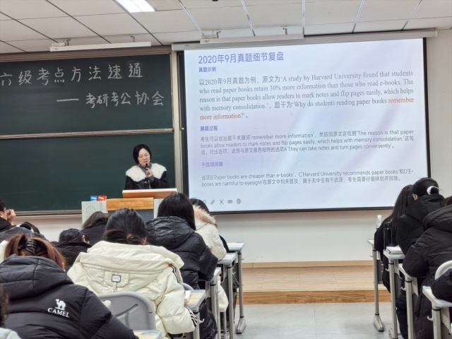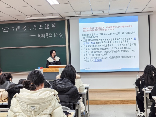 讲座环节中,张老师以“全局视角+专项突破”为逻辑主线,层层递进拆解备考关键。她先从四六级考试整体架构切入,清晰梳理各题型考查重点与分值分布,特别点透听力与阅读的“共性训练逻辑”、写作与翻译的“协同提升路径”,帮同学们跳出“单点刷题”的局限,搭建起系统化复习框架。
