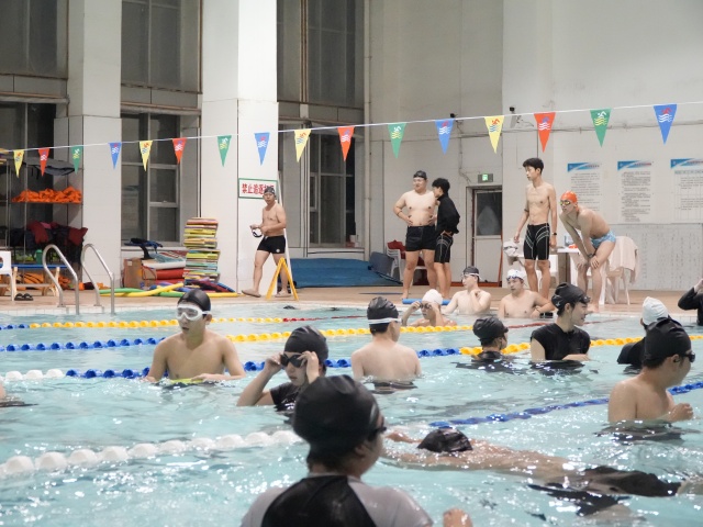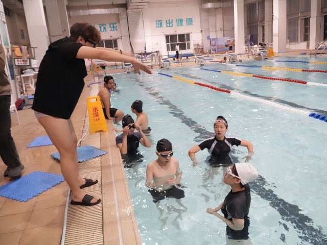 零基础组在浅水区稳步展开训练:先通过陆上模拟练习熟悉腿部蹬水与手臂划水动作,打好基础;随后在教练一对一指导下,逐步尝试水中漂浮、扶板滑行等实践环节,帮助每位同学实现至少一次独立漂浮,顺利迈出下水的第一步。基础薄弱组则在教练的细致指导下,重点纠正蛙泳、自由泳中的动作细节,并在教练陪护下尝试深水区短距离游进,逐步增强信心与能力。泳池里水花轻扬,笑声不断,同学们专注投入,展现出积极向上的青春风貌。
