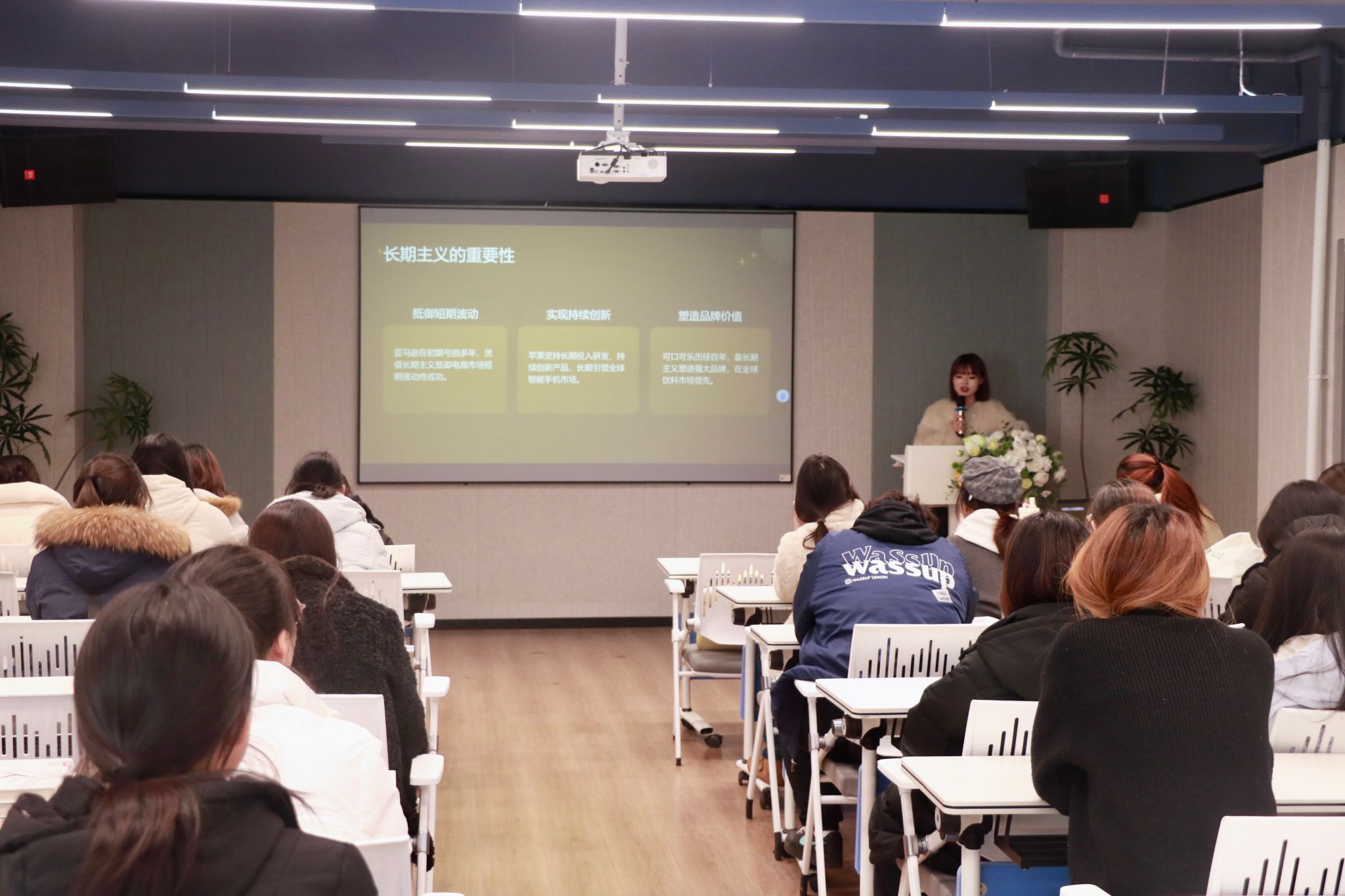 在热烈的掌声中,李昭璇老师登台,以贝佐斯《长期主义》为核心,系统拆解了领袖们的底层思维。她首先阐释了“长期主义”,指出亚马逊甘受早期亏损、持续投入物流基建,与苹果坚持创新战略的本质相同——都是以长期确定性抵御短期波动,塑造持久品牌与壁垒。随后,她深入分享了亚马逊著名的“Day 1”哲学,强调企业应永远像创业第一天那样,保持活力、专注客户并敏捷响应变化,这是避免组织僵化、持续创新的关键。最后,她将这些商业智慧延伸至个人成长,鼓励大家在学业、职业规划中运用长期思维,注重耐心积累与长远布局。