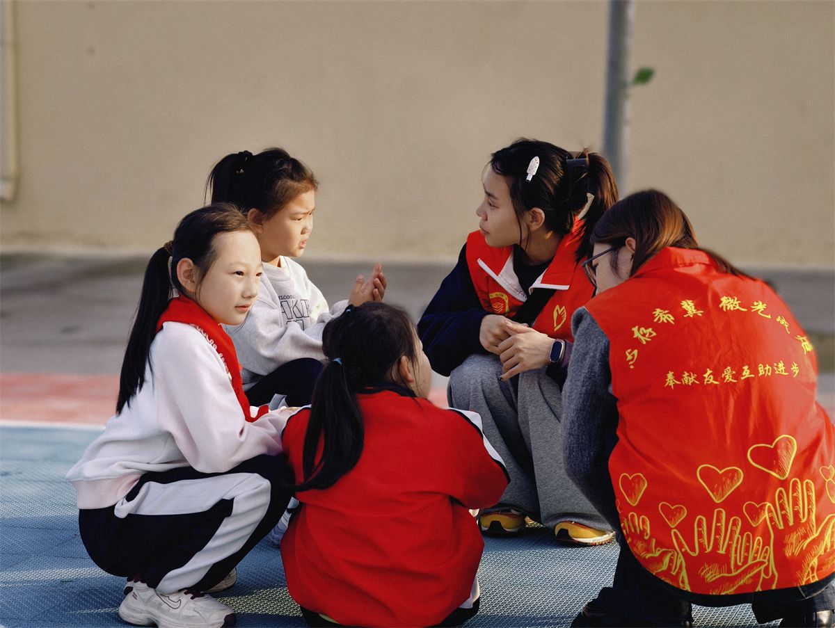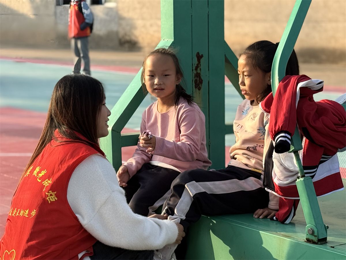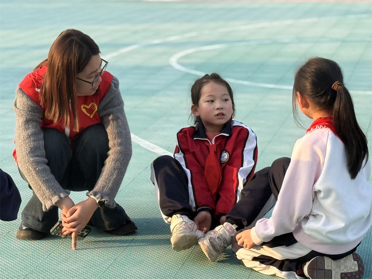 在操场边树荫下的长椅上,本次活动的“场外”环节——暖心交谈也在同步进行。一些志愿者没有参与激烈的游戏,而是选择静静地坐在孩子们身边,与他们聊学习、谈爱好、分享生活中的小趣事。