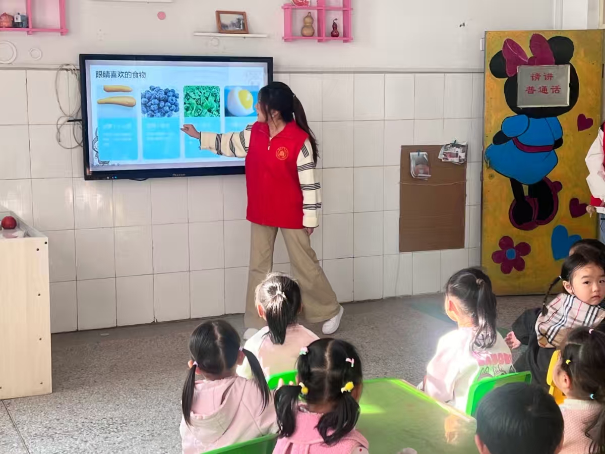 紧接着,志愿者聚焦护眼食物,用比喻助小朋友记忆。志愿者举例“胡萝卜小火箭”“蓝莓小宝石”等,小朋友们听得兴致勃勃,也互相分享了自己爱吃的水果蔬菜,表示自己会多吃这些蔬菜水果来保护视力。