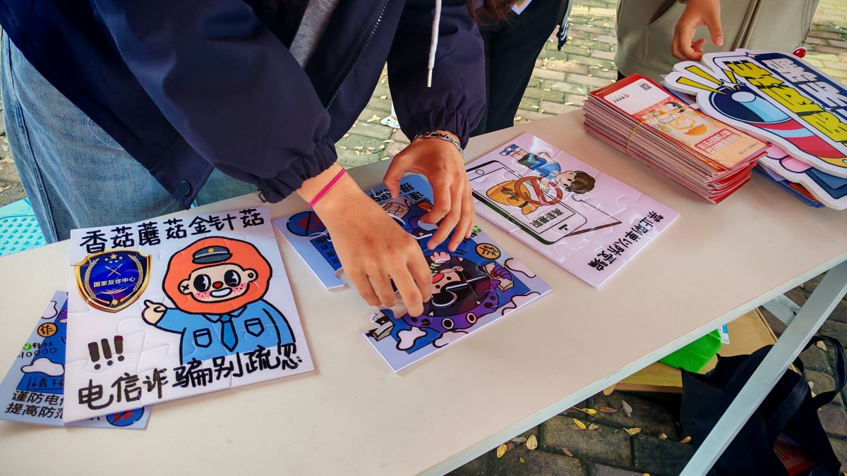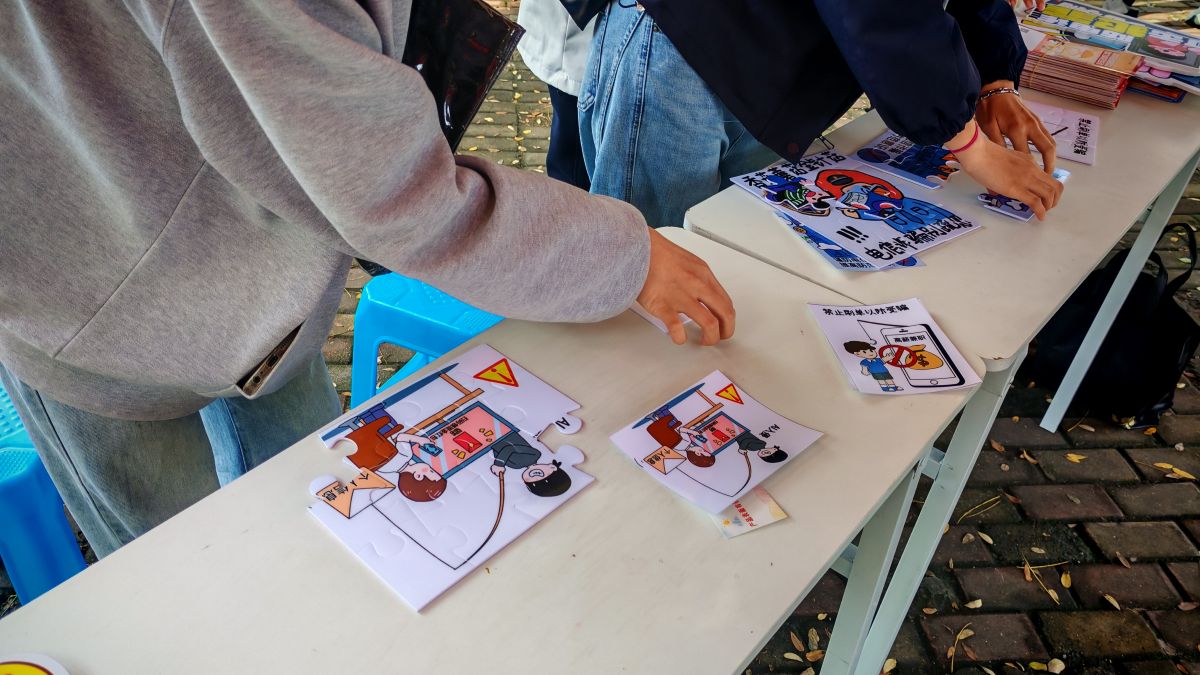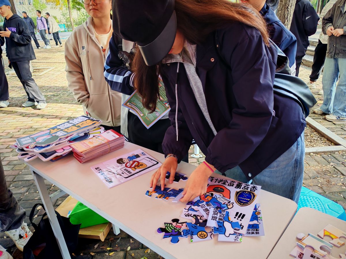 活动现场气氛热烈,志愿者们精心准备了图文并茂的《反诈宣传手册》,内容涵盖校园常见骗术解析、防骗口诀和应急处理指南,成为学生手中实用的“反诈宝典”。此外,定制钥匙扣、反诈拼图、主题贴纸等文创产品也广受欢迎,成为了同学们争相收集的“热门单品”,让反诈意识在轻松愉快的氛围中悄然深入人心,在互动中加深对诈骗手法的识别能力。