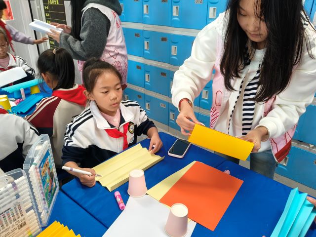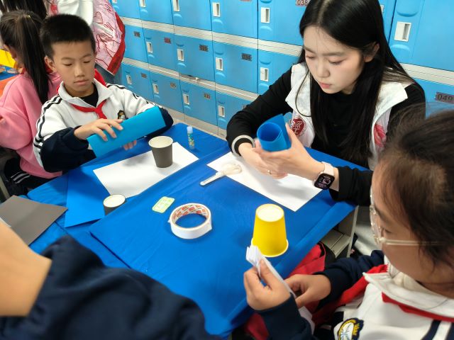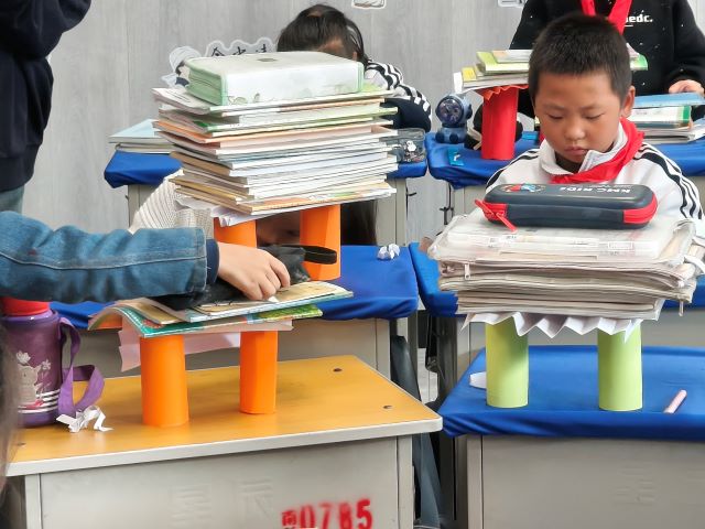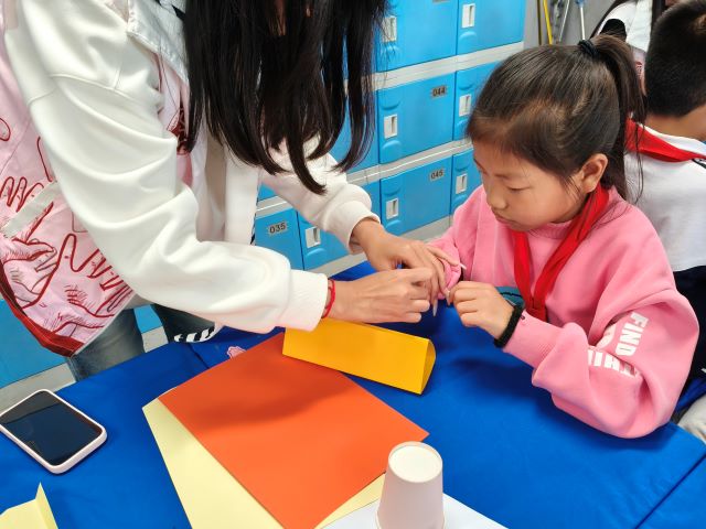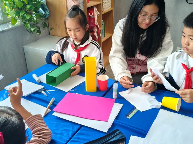 接着进入“分组创作攻坚”环节:孩子们分工合作,有的负责画设计图,有的尝试折叠不同形状,有的专注固定接口。过程中,志愿者全程针对“纸筒卷得太松容易塌”“支架间距不均会倾斜”等问题进行指导,引导孩子自主调整,而非直接给出答案。比如有小组搭建的“四角支架”总倾斜,志愿者提示“试试让四个支架高度一致、距离中心一样远”,让孩子在试错中掌握技巧。最后是“承重测试对决”环节,也是活动的高潮。志愿者让同学们准备了不同重量的书籍,从最轻的笔记本开始,逐组为纸结构加载重量。当一组孩子用“多层波浪纸叠加+纸筒支撑”的结构,成功托起厚书时,现场响起热烈掌声;也有小组的结构在放第二本书时倒塌,孩子们却立刻讨论“刚才纸筒没粘牢,下次要多缠几圈胶带”。测试结束后,志愿者带领大家复盘,让每组分享设计思路,总结“哪种结构承重更强”,把实践经验转化为科学认知。