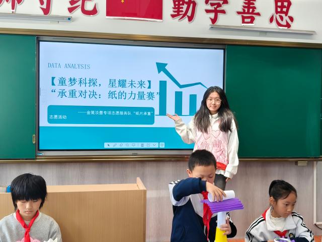 此次“纸片承重”志愿活动,不仅让孩子们在实践中直观感受了科学的魅力,更培养了他们的团队协作能力与创新思维。金笺淡墨专项志愿服务队一直致力于通过丰富多样的实践活动,培养学生的科学素养和动手能力。相信在这样充满趣味与创意的科学活动中,同学们将不断探索未知,在科学的海洋中快乐遨游。未来,我们会继续开展更多精彩的科学实践活动,为孩子们的成长增添更多绚丽的色彩。