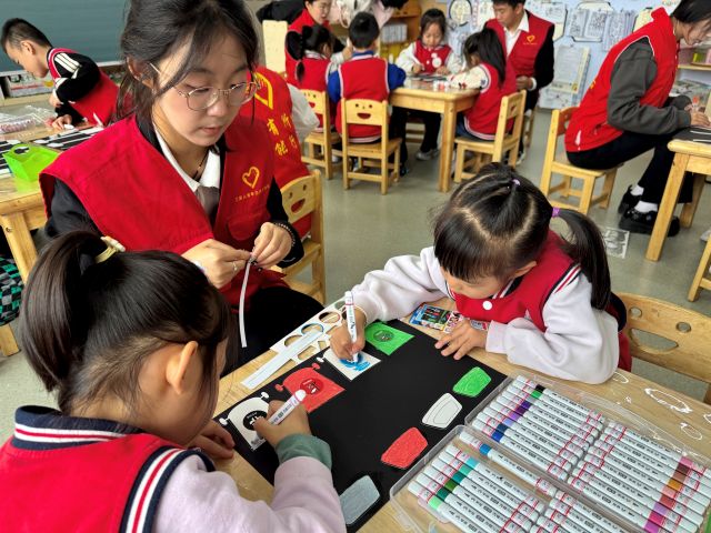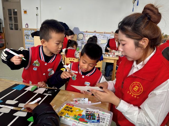“现在,我们要当‘环保小向导’,帮垃圾宝宝找到正确的家啦!”随着志愿者的号召,活动进入核心游戏环节——“垃圾宝宝找家”。孩子们以4人为一组领取专属“任务包”(含空白垃圾桶卡片、垃圾图案卡片、彩笔和胶棒),在“创意设计家”环节发挥想象涂色——给每一个“垃圾桶”涂上专属颜色;随后在“分类小能手”挑战中,小朋友们认真辨认垃圾卡片,在志愿者指导下将“塑料瓶”“果皮”“电池”分别贴进对应颜色垃圾桶,完成正确分类的孩子还能获得专属贴纸,让环保动力更足。