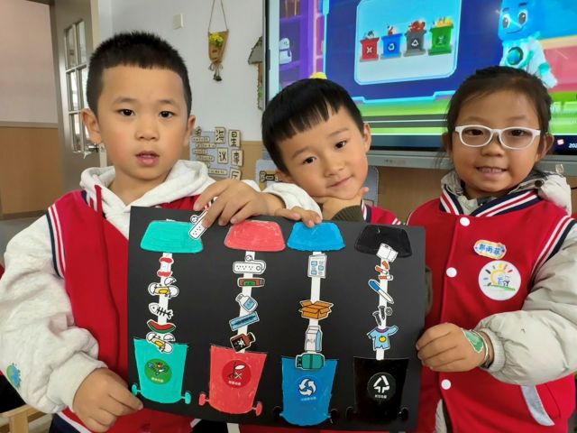 “我画的是绿色厨余桶,果皮放进去能变成肥料,让小树长高!”“电池有毒,要放进红色桶里。”在作品展示环节,小朋友依次走上台前,举着自己制作的“环保垃圾桶”,用稚嫩却清晰的声音分享收获。台下的小伙伴们听得认真,时不时点头附和,环保的认知在童言童语中悄然深化。