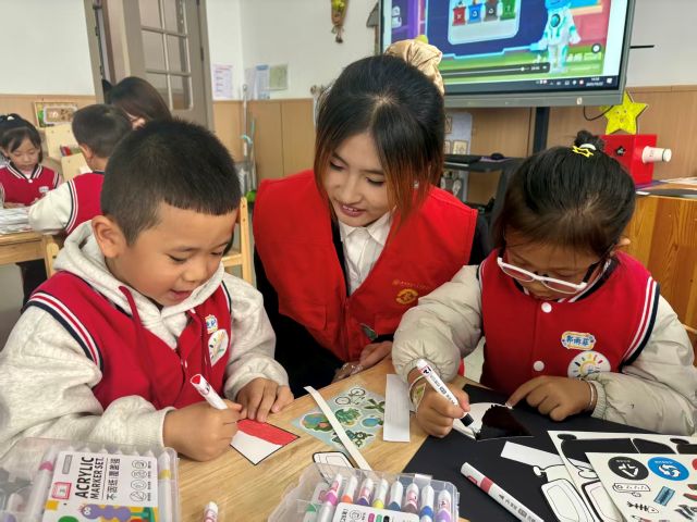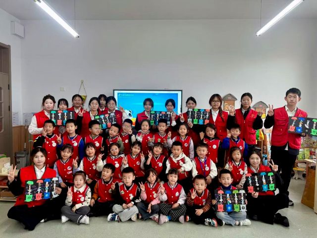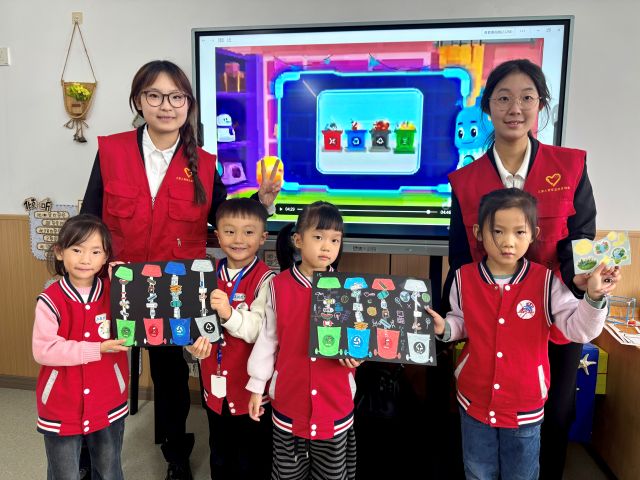活动接近尾声,全体小朋友与志愿者一起合影留念,镜头定格下这充满意义的瞬间。更暖心的是,志愿者没有直接收拾场地,而是带领孩子们一起整理彩笔、胶棒,将垃圾卡片按类别收纳,“用完的东西要归位,垃圾要分类放好”——环保的理念,就这样融入了收尾的每一个细节里。