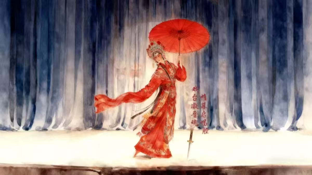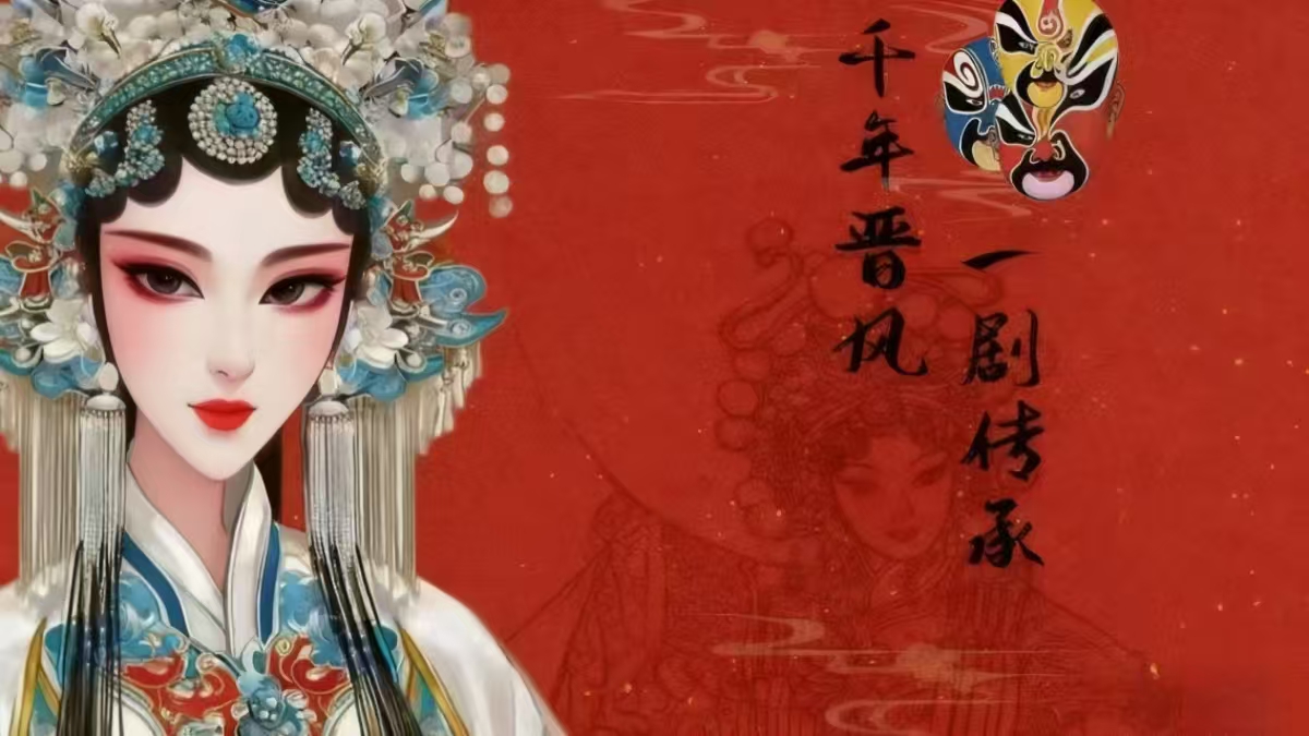 水袖轻扬、红伞映面的晋剧角色海报,正是本次活动的创意代表作之一:水彩晕染的戏曲服饰里藏着AI精修的纹样细节,传统戏台布景与数字笔触的朦胧质感交融,一句“惟幕启唱腔,戏台凝晋魂”更把晋剧的婉转韵味和文化根脉稳稳托出。画中红装、花钿、配剑的经典元素,既是对晋剧行当的传神还原,也是AI技术对非遗美学的年轻化转译——当Z世代用科技为传统“开新挂”,晋剧不再是只存于戏台上的遥远腔调,而是能握在指尖、刷进屏幕的青春潮品。