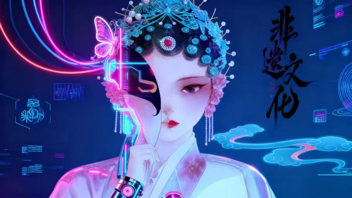 以“千年晋风,一剧传承”为核,将晋剧旦角的妆面神韵与AI数字美学完美糅合:头饰上蓝白相间的点翠纹样经AI精细渲染,既保留了传统戏曲头面的华贵质感,又添了几分二次元式的灵动精致;背景里若隐若现的戏装轮廓、右上角叠映的晋剧脸谱,更用科技手法把“非遗元素集群”搬进画面。当传统戏曲的眉眼风情撞上AI的细腻笔触,这份作品既守住了晋剧的文化根骨,又长出了Z世代钟爱的潮流颜值——非遗不再是“老古董”,而是能以新面目圈粉年轻群体的文化新宠。