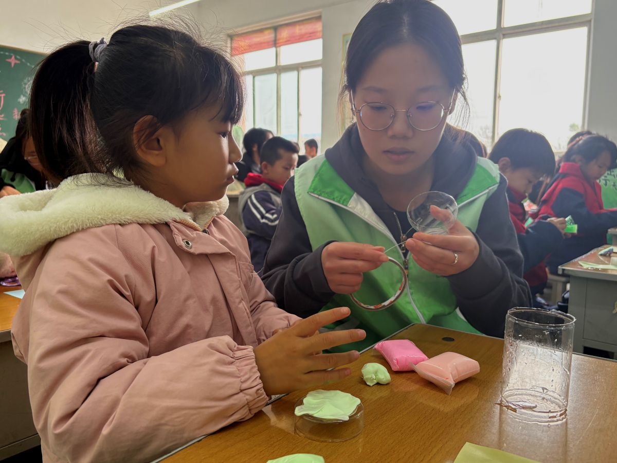 为了给孩子们营造更为广阔的创作天地,队员们精心准备了彩纸、黏土、画笔等多种多样的材料。这些材料井然有序地陈列在教室后方的桌子上,宛如一座微型的“创意宝库”。孩子们可以根据自己的兴趣和创意,自由挑选心仪的材料进行创作。有的孩子青睐彩纸,专注地折叠出栩栩如生的小兔子和精致的小纸船;还有的拿起画笔,在画纸上勾勒出蔚蓝的天空、洁白的云朵、繁茂的花草和挺拔的树木,尽情抒发着对美好事物的无限想象。