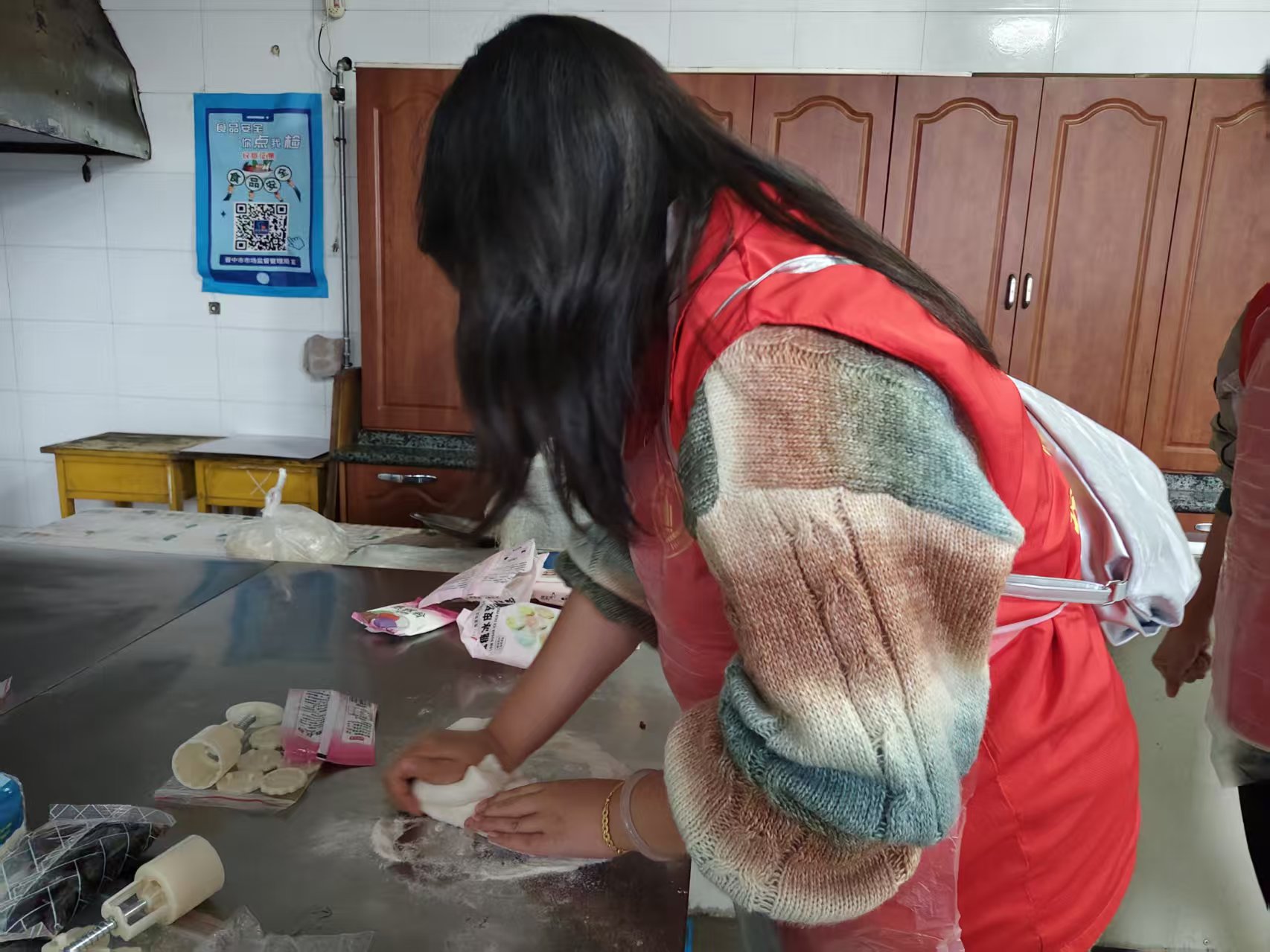 “揉面团要顺时针转,力度轻一点,不然冰皮容易破。”有过烘焙经验的志愿者小牛,一边演示一边向身边的同伴讲解技巧。大家围坐在长桌旁,分工明确:有的负责揉制冰皮,将面团搓成均匀的小圆球;有的专注称量馅料,确保每个月饼的分量一致;还有的拿着模具,将包好馅料的面团压成一个个造型精致的月饼。刚开始,不少志愿者的动作还略显生疏,冰皮偶尔会粘在手上,馅料也会不小心露出来,但大家互相帮忙、反复尝试,很快就掌握了技巧。