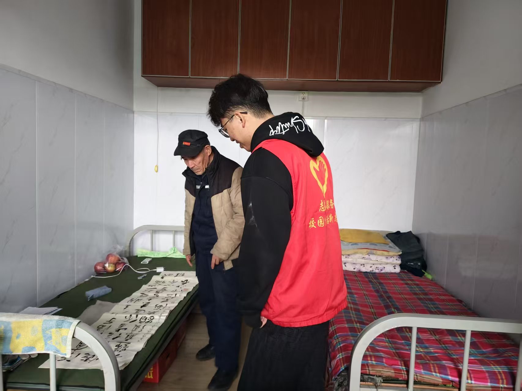 表演间隙,志愿者们没有急着离开,而是拉过椅子坐在老人身边,陪他们唠起家常。刘奶奶翻出抽屉里的老照片,给志愿者讲起自己年轻时的故事;志愿者小杜了解到王爷爷对书法颇有研究,便走进屋内,与爷爷热切地探讨起书法知识。从笔法的运用到字体的演变,一老一少交流得十分投入。雨声敲打着窗棂,房间里的交谈声、笑声交织在一起,小小的空间里满是跨越年龄的温情。志愿者们的脚步走遍了养老院的每一间老人宿舍,把欢乐与陪伴送到了每位老人身边。