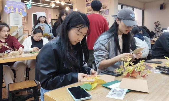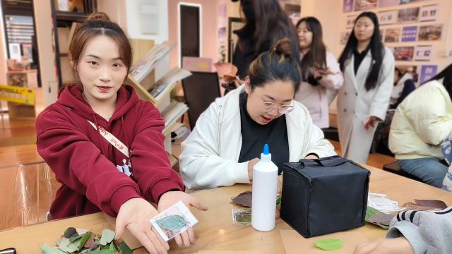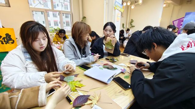 在落叶收集环节结束后,大家纷纷带着自己的“战利品”前往活动指定的创作区域,开始了紧张而有趣的创意制作。有的同学专注地将落叶整理平整,小心翼翼地夹进透明书签里面弄平整;有的同学则发挥自己的绘画天赋,在落叶上勾勒出可爱的卡通形象、优美的风景图案;还有的同学用落叶编织出落叶魔法帽、手链等手工艺品。整个创作区域充满了创意的火花,每个人都在用心打造属于自己的秋日作品。