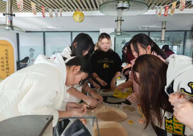 饼干制作环节率先开启,现场迅速被食材的清香包裹。参与者们按比例称量面粉、黄油、糖等食材,将软化的黄油与糖充分搅拌至蓬松,再逐步加入面粉揉成光滑面团。擀皮、压模、摆放,大家专注于手中的每一个动作,指尖的力道随着面团的变化调整,学业带来的焦虑与浮躁在揉捻与塑形中慢慢消散。遇到面团粘手、模具脱模困难等问题时,伙伴们也互相支招,现场氛围轻松又热闹。