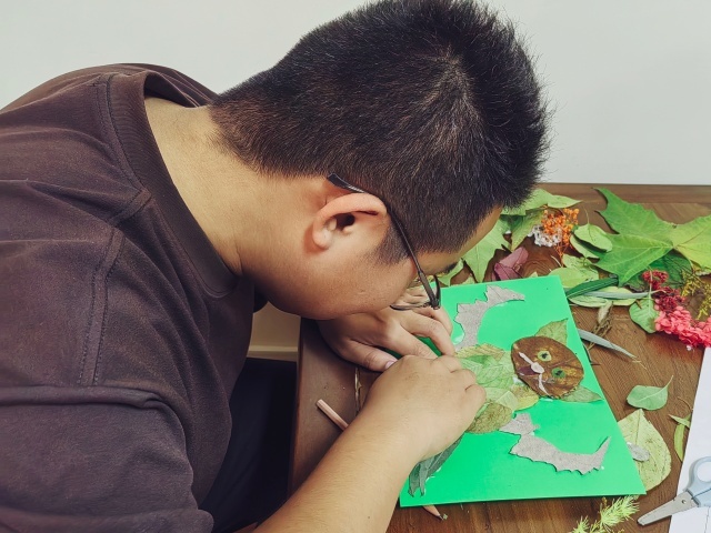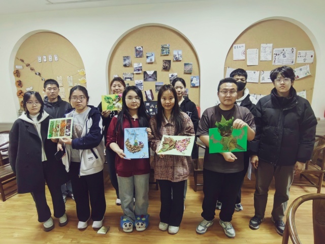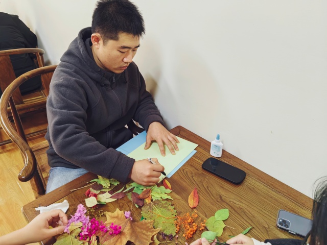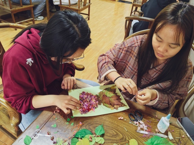 活动刚开场,志愿者们便带着收纳袋走进校园角落,轻轻拾起银杏叶、枫叶、栾树果等自然“素材”——阳光下,两名女生踮脚从枝头摘下橙红的小果实,叶片簌簌落在掌心,成了最鲜活的创作原料。回到书院活动室,木桌被深浅不一的叶材铺满:明黄的银杏、绛红的枫叶、细碎的紫花……志愿者们围坐在一起,或低头裁剪叶片轮廓,或用胶水将叶材拼贴成画,活动室里只听得见剪刀轻响与偶尔的创意讨论。
