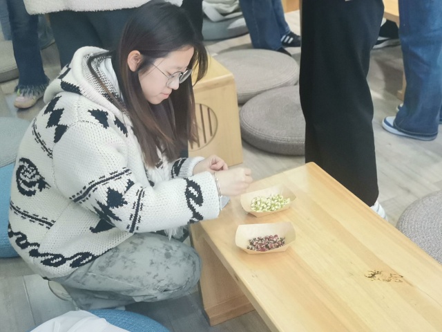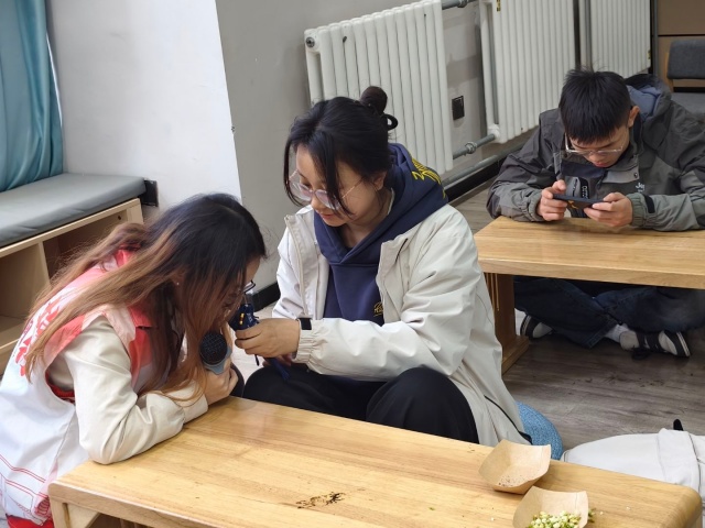 “闻香识药”环节成为本次活动的首个亮点。志愿者现场展示了艾叶、藿香、苍术等制作庆阳香囊的地道中药材,引导同学们通过观察形状、辨识颜色、嗅闻气味等方式区分不同药材。艾叶的清香能驱蚊避秽,藿香可以芳香化浊,这些药材的搭配既是民俗智慧,也是中医文化的体现。志愿者详细讲解了每种药材的药用价值与在香囊中的功效,并设置了小型辨识挑战赛,同学们踊跃参与、相互探讨,在趣味互动中加深了对传统药材的了解。