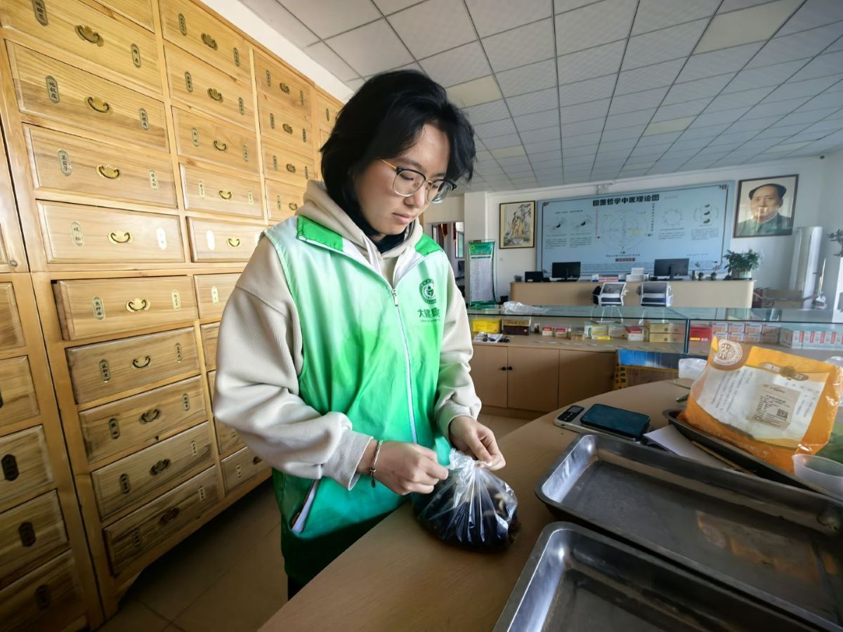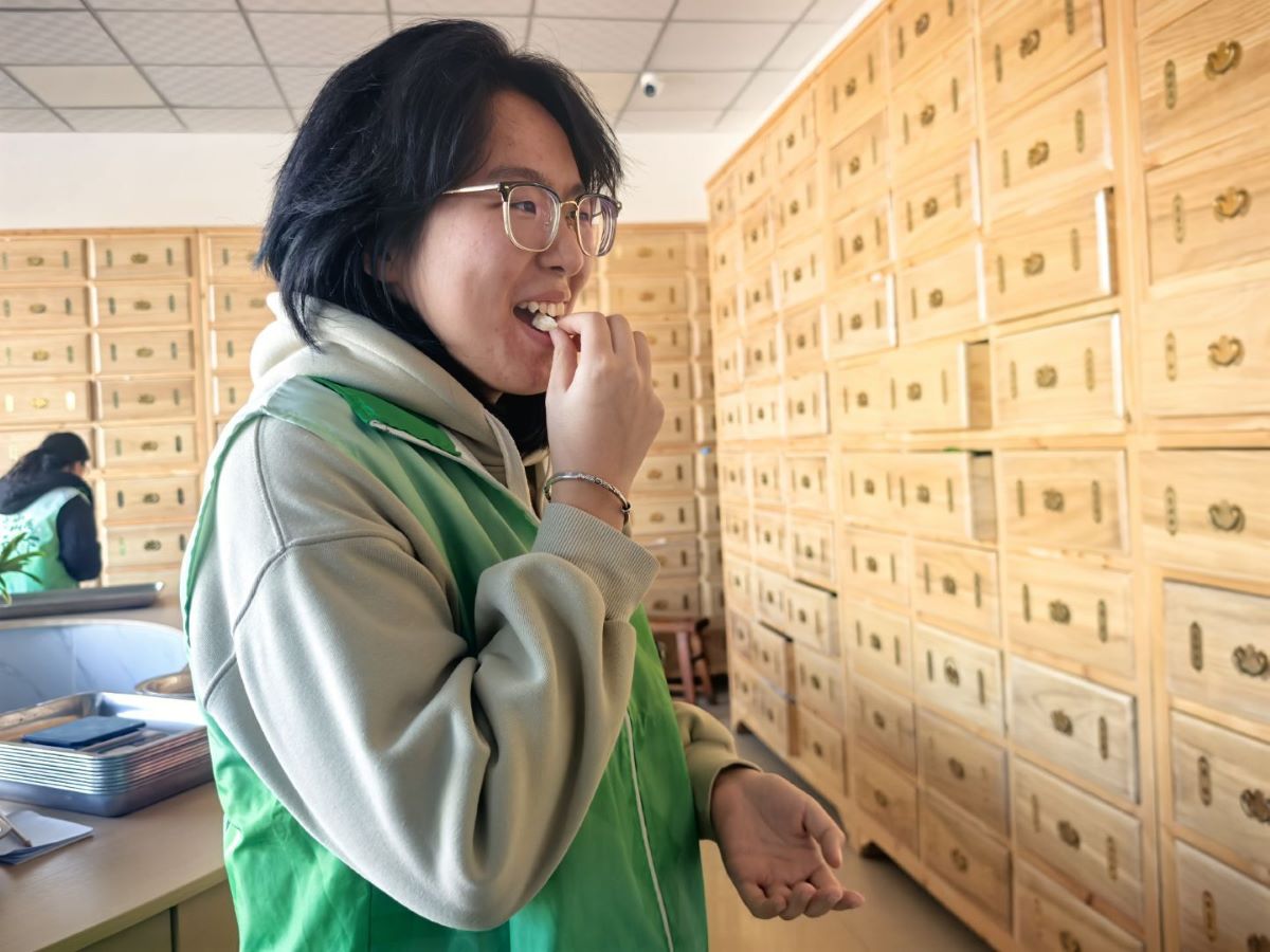 志愿者的身影在药香间灵动穿梭,指尖轻触药材,好奇追问,拆解学习着药材分类与贮存的隐秘:数百种饮片在“看、闻、摸”的轻触里苏醒,秋日润肺的银耳百合、冬日御寒的黄芪当归,寻常食材里蜷着的养生密钥,便在鼻息与指腹间,舒展成可触的暖意。
