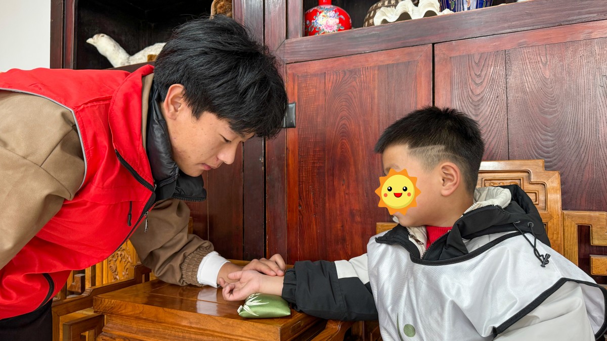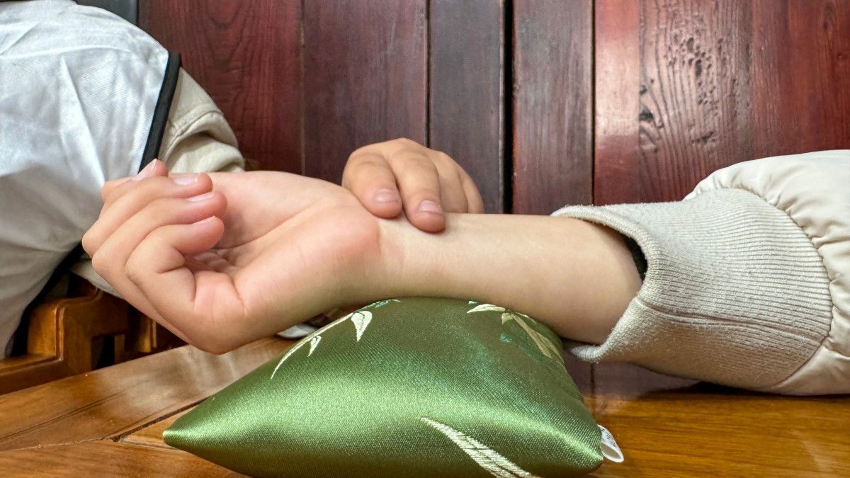 “小郎中上岗啦!”最后一个环节,孩子们兴奋地系好模拟腕枕,在志愿者一对一指导下学习把脉。“食指放在这里,对,这就是关脉……”孩子们轻轻按压同伴的手腕,专注地感受着生命的跳动。“你的脉搏像小马跑一样有力!”在互相练习中,切脉从抽象的概念变成了真实的触感。这一刻,中医的“切脉”不再是遥远的名词,而是可触摸的体验。进度条满载100%,这趟中医药启蒙之旅在孩子们灿烂的笑容中画上了句号。
