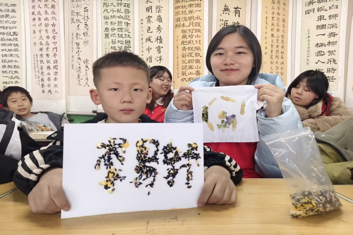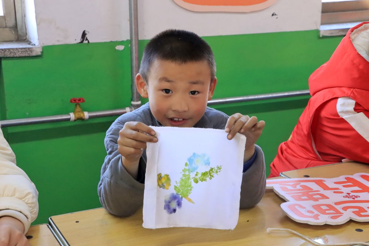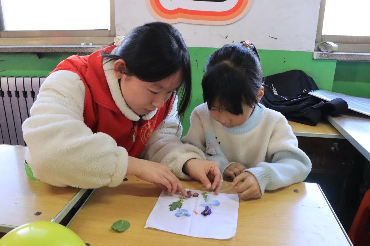 活动接近尾声,孩子们兴奋地拿出自己亲手制作的植物拓印手帕、中国结和种子画,迫不及待地向志愿者和小伙伴们展示。小小的手帕上,树叶、花朵的印记清晰又别致;精致的中国结,红绳交织间满是巧思;创意十足的种子画,用五谷杂粮勾勒出各种有趣的图案。志愿者们认真欣赏每一件作品,真诚地赞美每个孩子的独特创意。这一刻,他们不仅是活动的组织者,更是孩子们创作路上的见证者和陪伴者。现场洋溢的成就感与欢乐氛围,正是志愿者与孩子们共同创造的珍贵记忆。