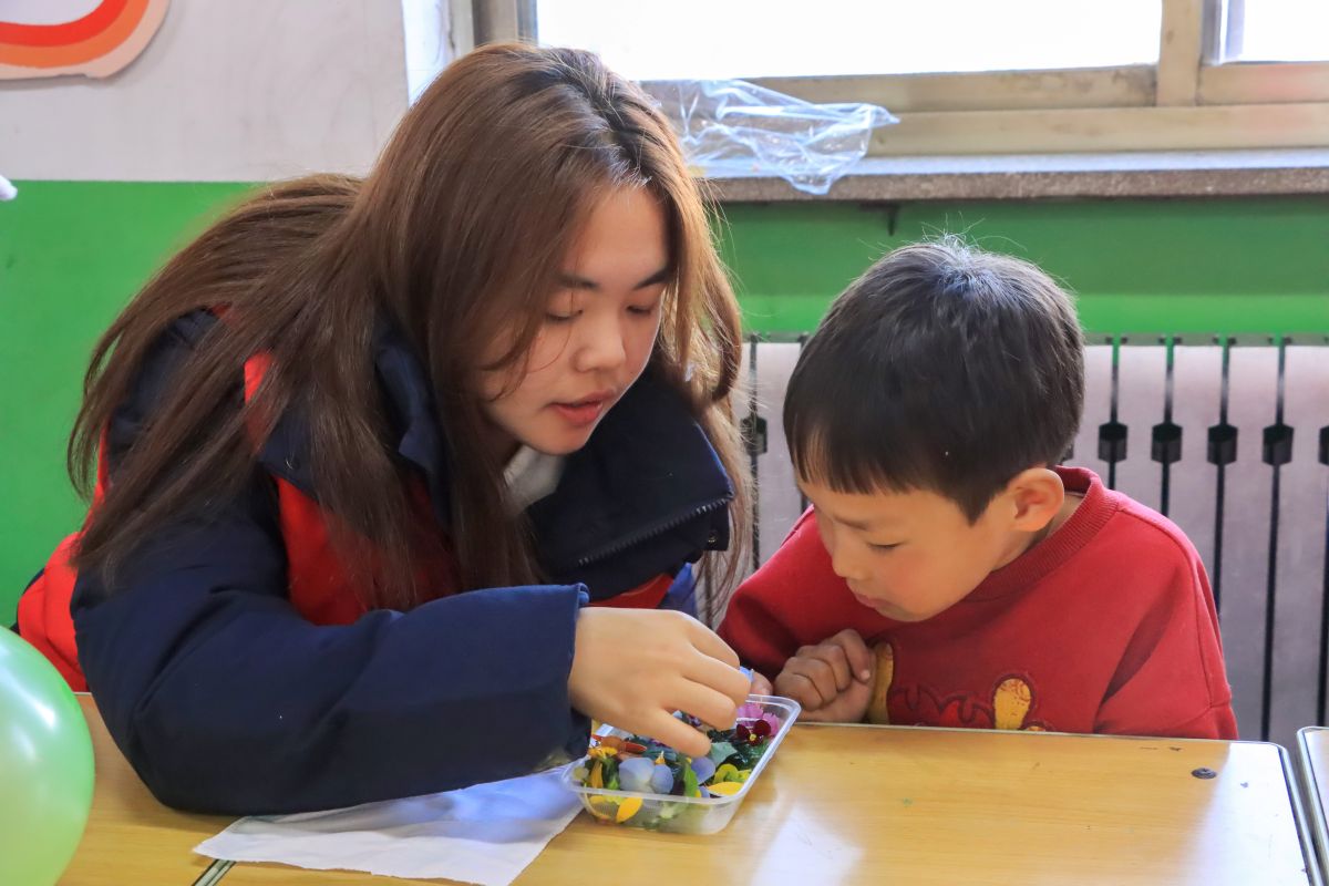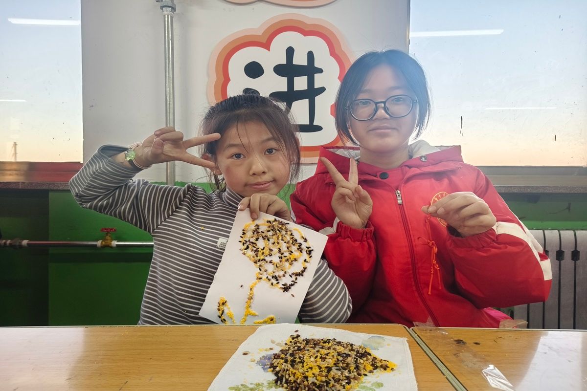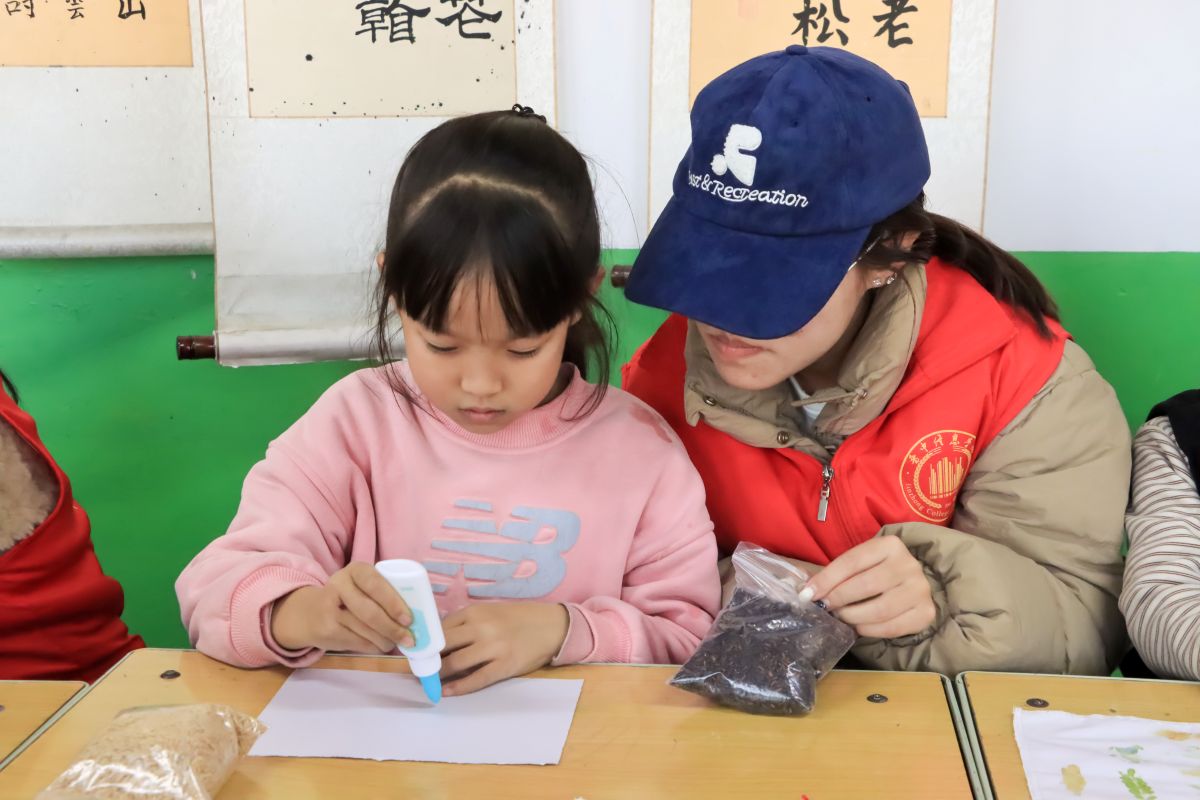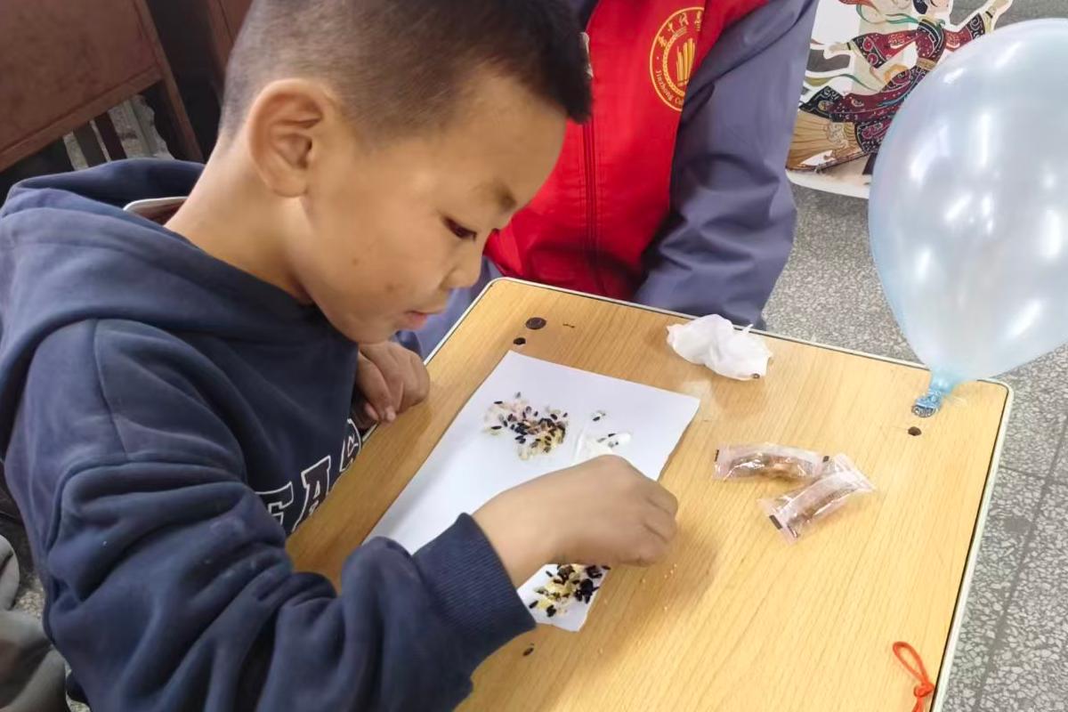 种子画创作环节让现场氛围达到高潮。志愿者以“麻屋子,红帐子,里面住个白胖子”的谜语引出主题,创作过程中,他们不仅指导孩子们如何粘贴种子,更鼓励大家发挥创意。有的志愿者跪坐在孩子身边,一起讨论图案设计;有的细心帮助年龄较小的孩子涂抹胶水。当一幅幅充满童趣的种子画完成时,志愿者们由衷地为每个孩子的创意鼓掌,这份陪伴让传统的农耕智慧在孩子们心中活了起来。