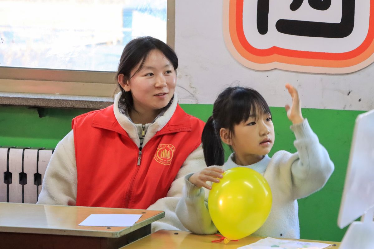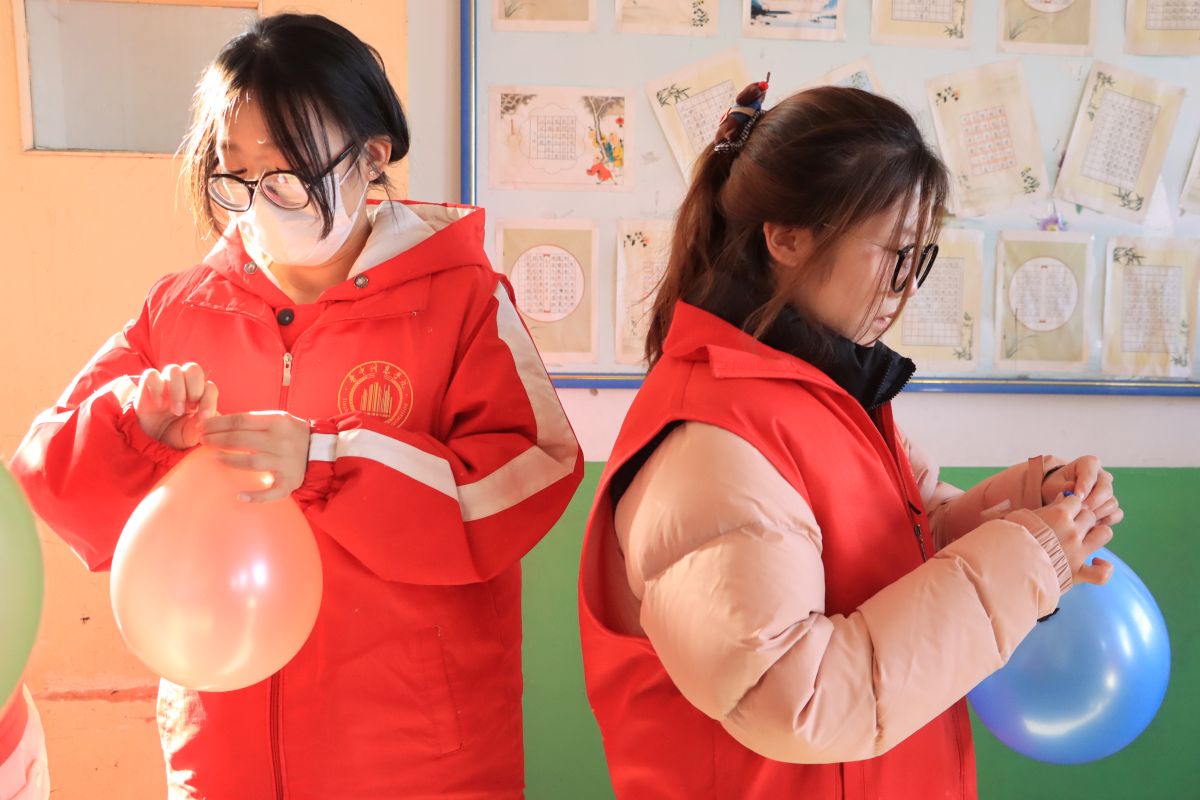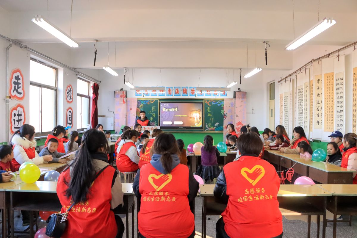 下午,志愿者们准时抵达校园,迅速投入活动现场的布置——贴装饰、打气球、绘制黑板报,每一个细节都凝聚着他们的用心。活动伊始,孩子们围坐一圈,在志愿者轻柔的讲述中观看非遗文化科普视频。随后,志愿者借助生动有趣的PPT开展非遗知识抢答,孩子们踊跃举手、积极回应,现场气氛热烈。志愿者们不仅传递知识,更用鼓励的眼神和亲切的互动,点燃了孩子们对非遗文化的浓厚兴趣。
