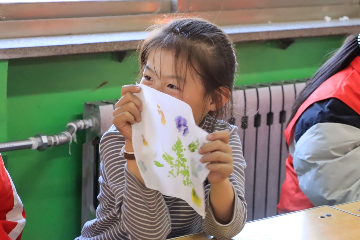 在植物拓染环节,志愿者们将新鲜树叶、花朵和白色手帕一一分发给孩子们,并细致讲解每种植物的形态特征。他们俯下身来,手把手指导孩子如何摆放植物、固定位置、控制敲击力度。随着一声声轻柔的敲击,叶脉的纹理渐渐显现在手帕上。志愿者们不时为孩子们的创意赞叹,也细心帮助遇到困难的孩子。当一件件独一无二的拓印作品完成时,孩子们脸上绽放的笑容,正是对志愿者的付出最好的回应。